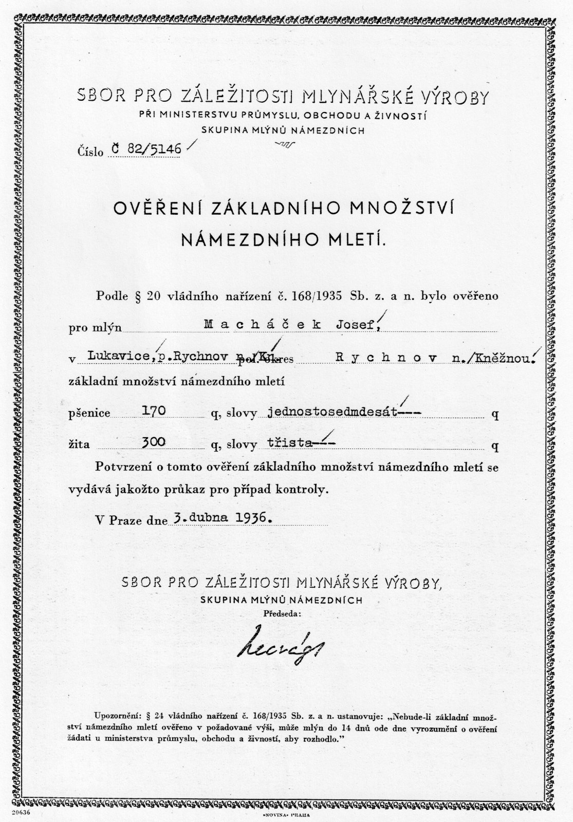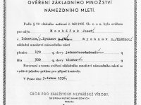 dokument o ověření množství mletí námezdního, 1936, © Sbor pro náležitosti mlynářské výroby