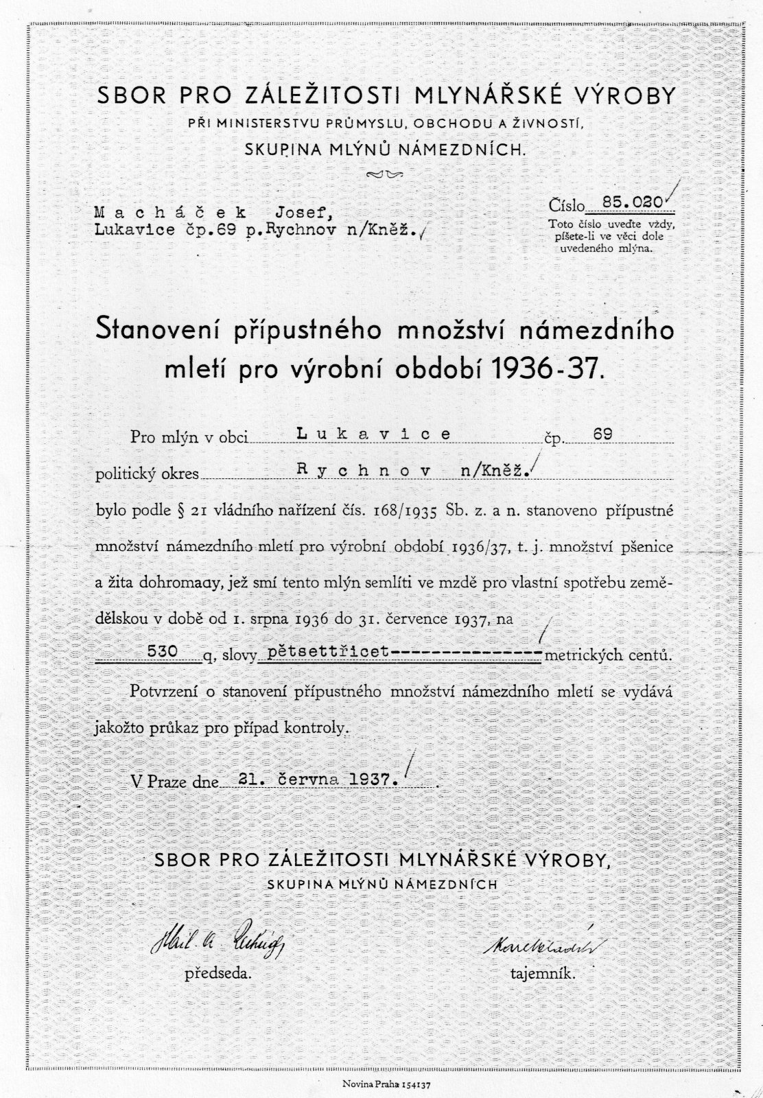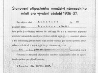 dokument o stanovení přípustného množství mletí námezdního, 1937, © Sbor pro náležitosti mlynářské výroby