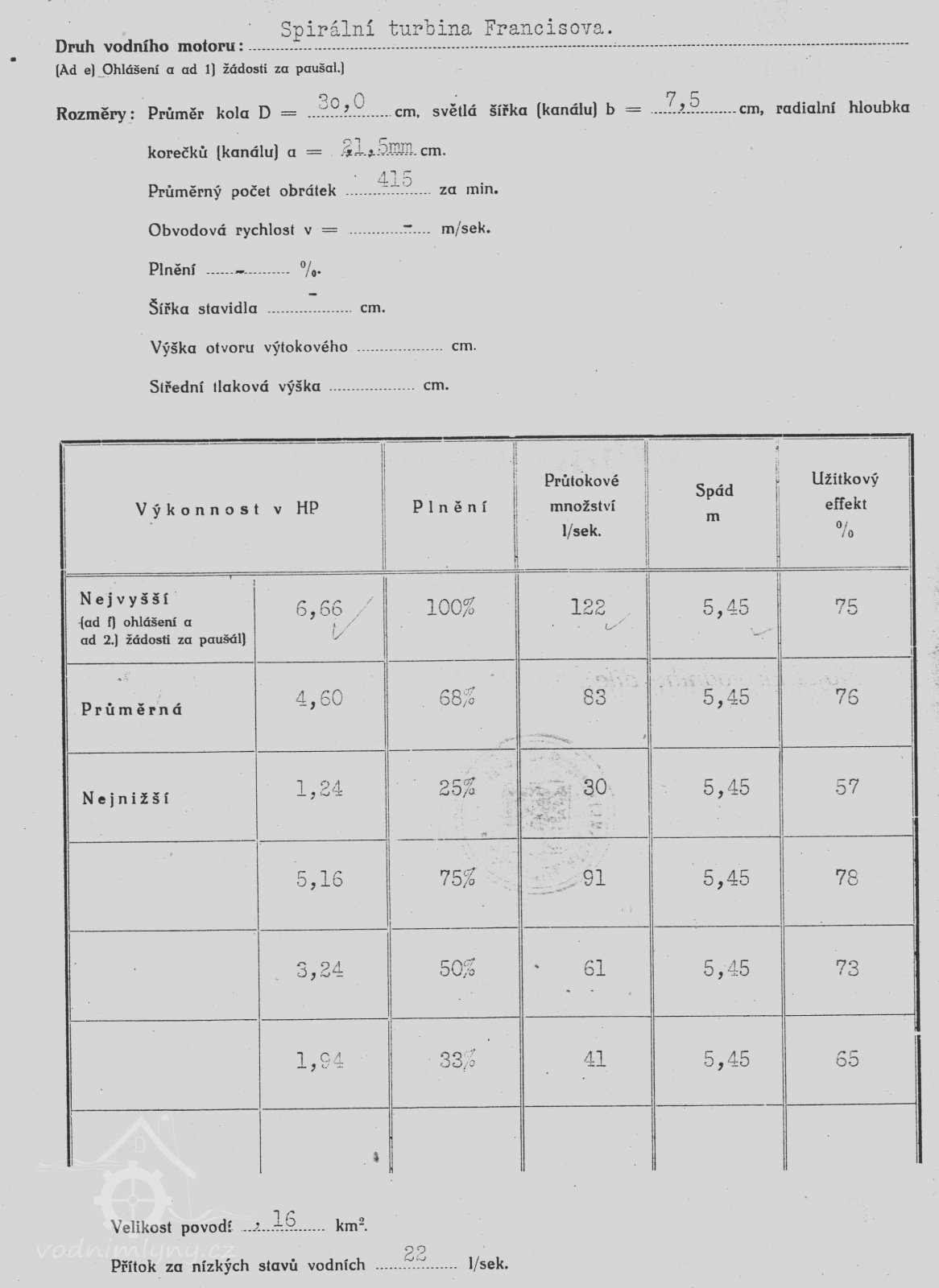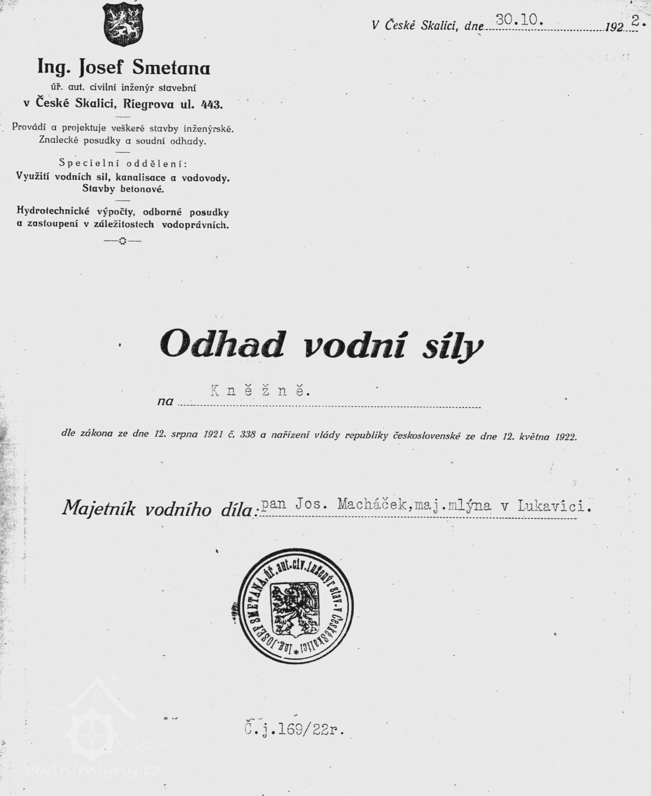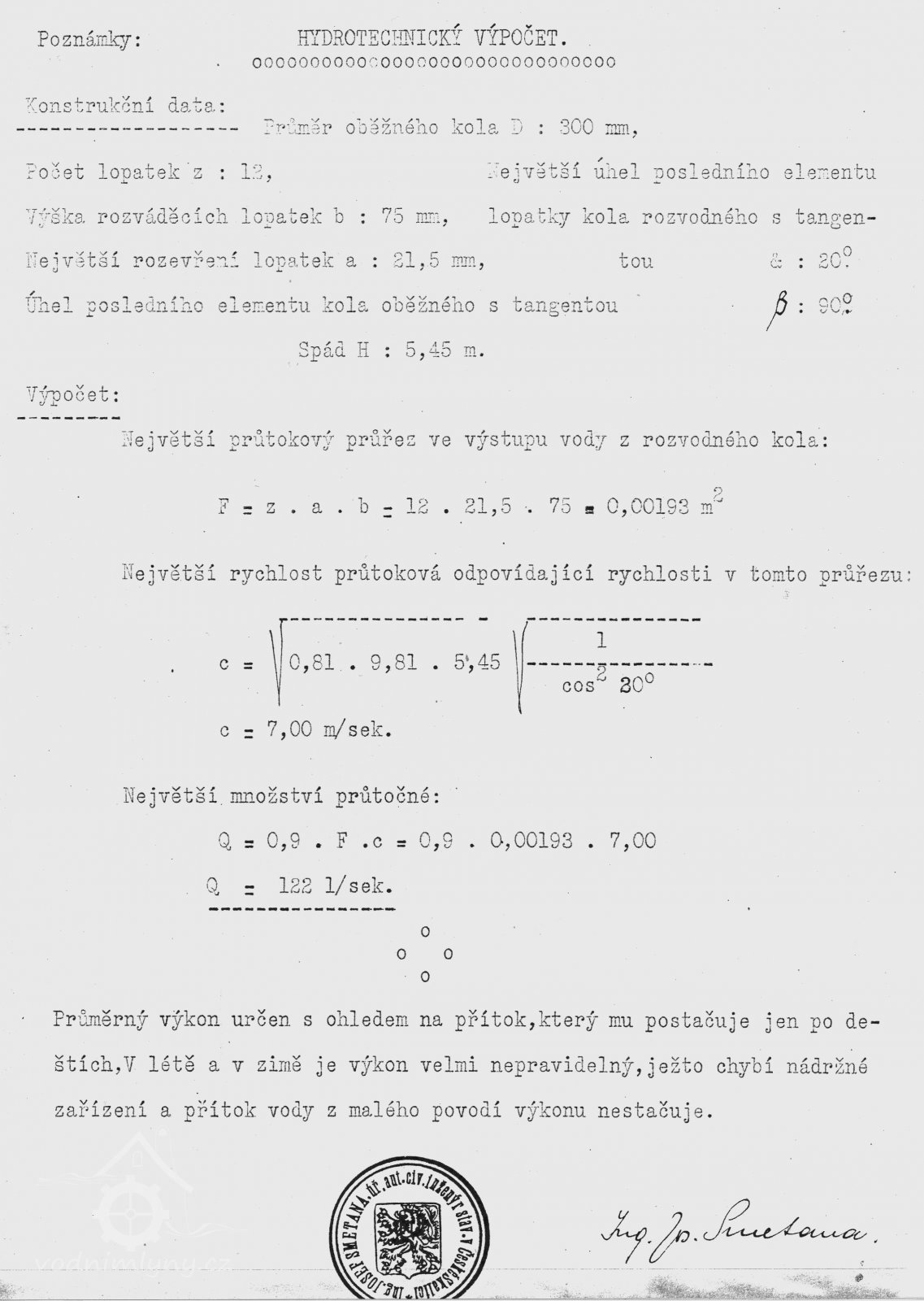 parametry a hydrotechnický výpočet, v České Skalici,1922, © ing. Josef Smetana