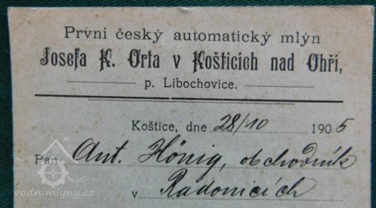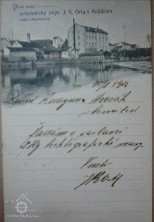 Mlynář Josef Karel Ort byl podnikavý člověk Pustil se do přestavby mlýna. Finanční krizi, zaviněnou překotným investováním, řešil odjezdem za výdělkem do Ameriky. Nebyl schopen splácet půjčky, jeho tchán mu odmítl pomoci a Josef před věřiteli doslova utekl. Původně pomýšlel v Americe zůstat a povolat tam i svoji rodinu. Jeho manželka však nakonec dlužné peníze dala dohromady, dluhy vyrovnala a Ort se vrátil do koštického mlýna. Po návratu modernizaci mlýna dokončil a ten se stal prvním českým automatickým mlýnem. Nahradil pohon šesti vodními koly turbínami, instaloval parní stroj, na světové výstavě v Paříži nakoupil moderní mlecí stroje, provozoval elektrárnu i pekárnu, které sloužily i potřebám obce Koštice. Od r.1902 mlýn poháněla jedna Francisova turbína, od r.1915 turbíny dvě. Koštická elektrocentrála poháněla nejen mlýn, ale zřídilo se i pouliční osvětlení v celých Košticích, mlýn dodával také elektřinu do domácností. Výpadky turbín později zajišťoval parní stroj.