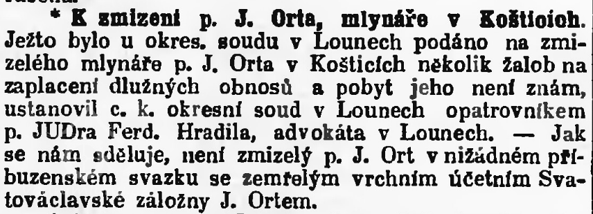 Manželé Jan a Anna Ortových kupují mlýn i přilehlý dům od Josefa Johna za 30000 zlatých. Ti předtím prodali svůj mlýn v Matrovicích u Mladé Boleslavi Albrechtu Kounicovi a zakoupili mlýn koštický. Měli čtyři děti: Josefa Karla, budoucího majitele mlýna, Annu, Boženu a Jaroslava. Ortovi mlýn r. 1886 předali synovi Josefu Ortovi s manželkou Antonií roz. Kopšovou, mlynářskou dcerou z Horek u Mladé Boleslavi. Josef později vedl spor o věno s jejím otcem.