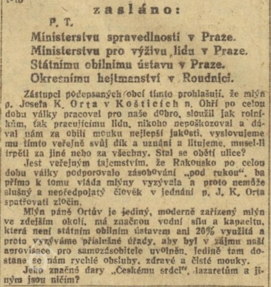 Po smrti mlynáře Josefa Orta 8. 4. 1927 majetek spravovala jeho žena Antonie. Poslední rekonstrukci koštického mlýna provedla v roce 1947 vnučka Josefa Orta Marie Loupalová nar. 1912 se svým manželem Josefem M. Blížencem.