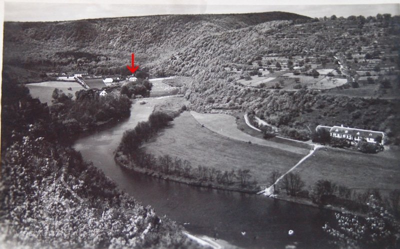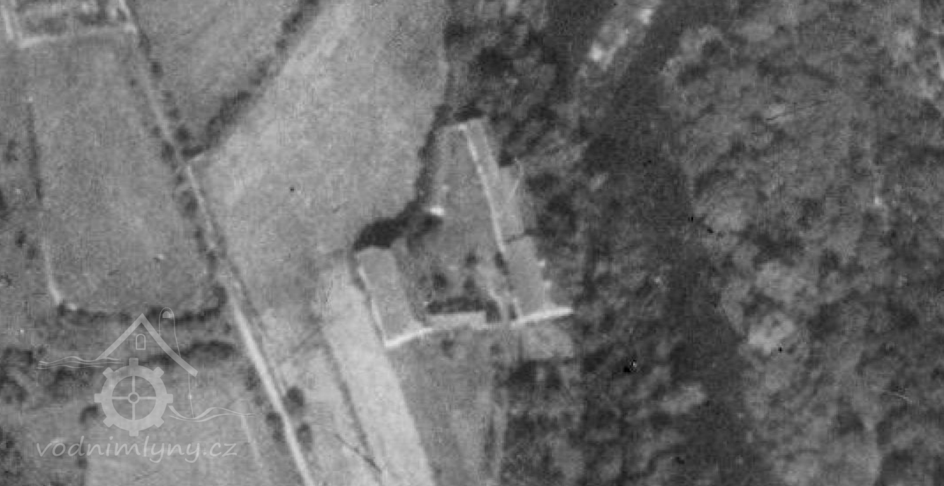 Na leteckém snímku z roku 1952 stojí mlýn ještě nepoškozen, zničen byl tedy až v pozdější době. (LR)