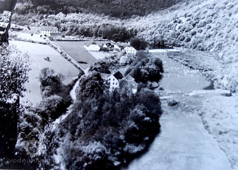 Na leteckém snímku z roku 1952 je mlýn zachycen ještě nepoškozen, zanikl tak až v následujících letech. (LR)