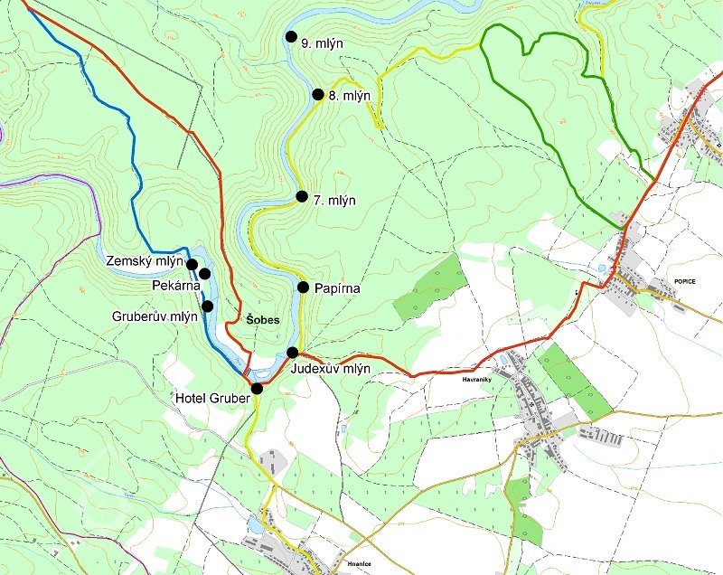Názvy šesti  mlýnů používané před II. světovou válkou: 1. Zemský mlýn, 2. Pekárna, 3. Gruberův mlýn, 4. Hotel Gruber, 5. Judexův mlýn a 6. Papírna.
