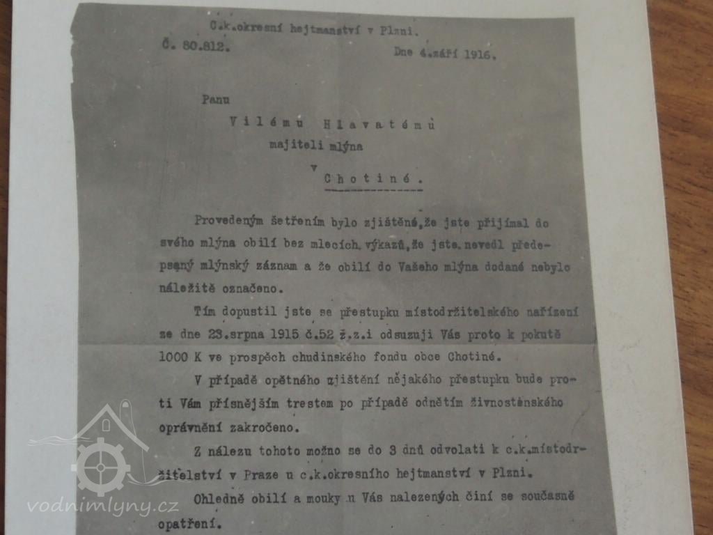 4.9.1916 byla mlynáři Vilému Hlavatému udělena pokuta 1000 K za černé mletí