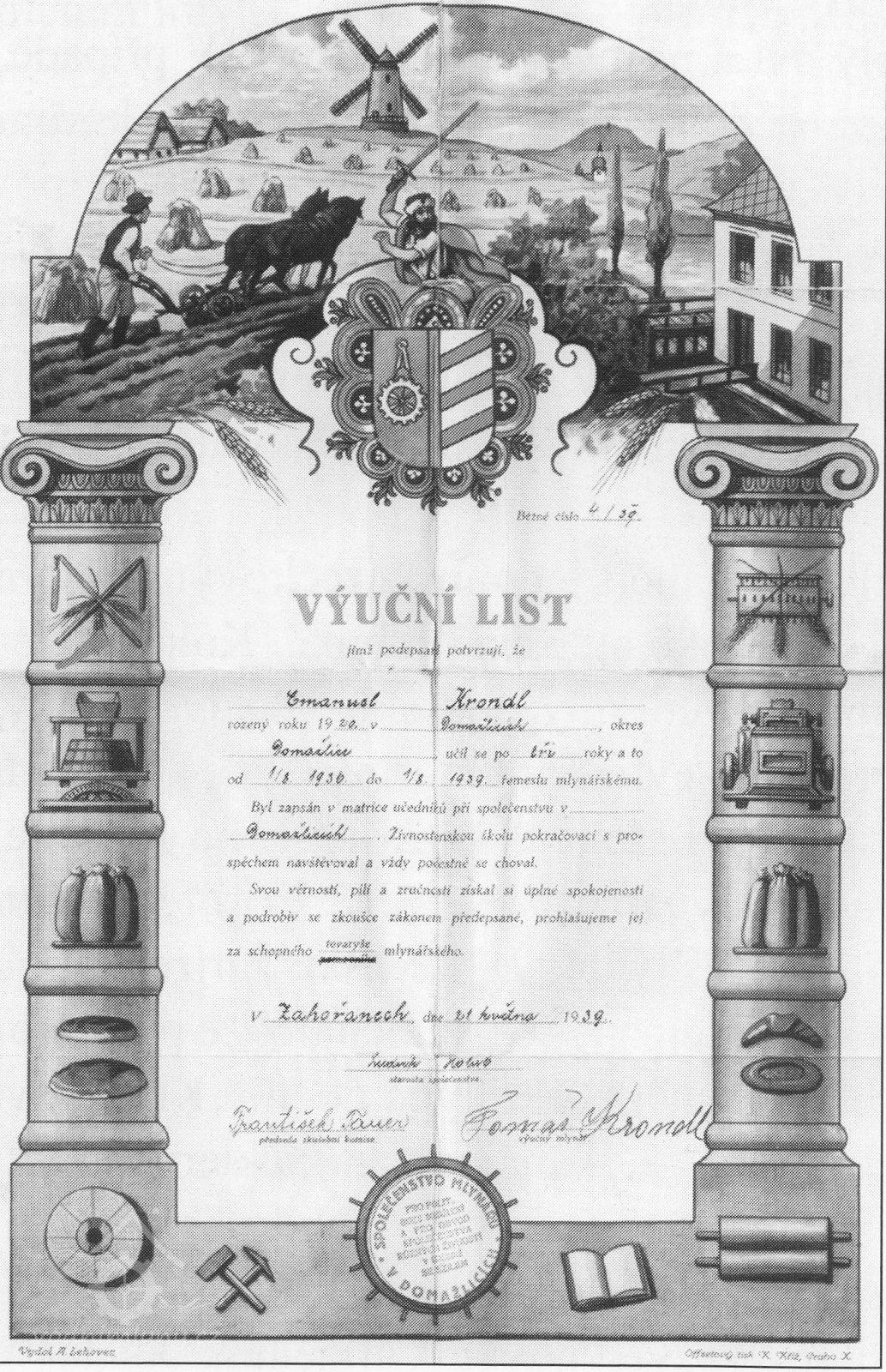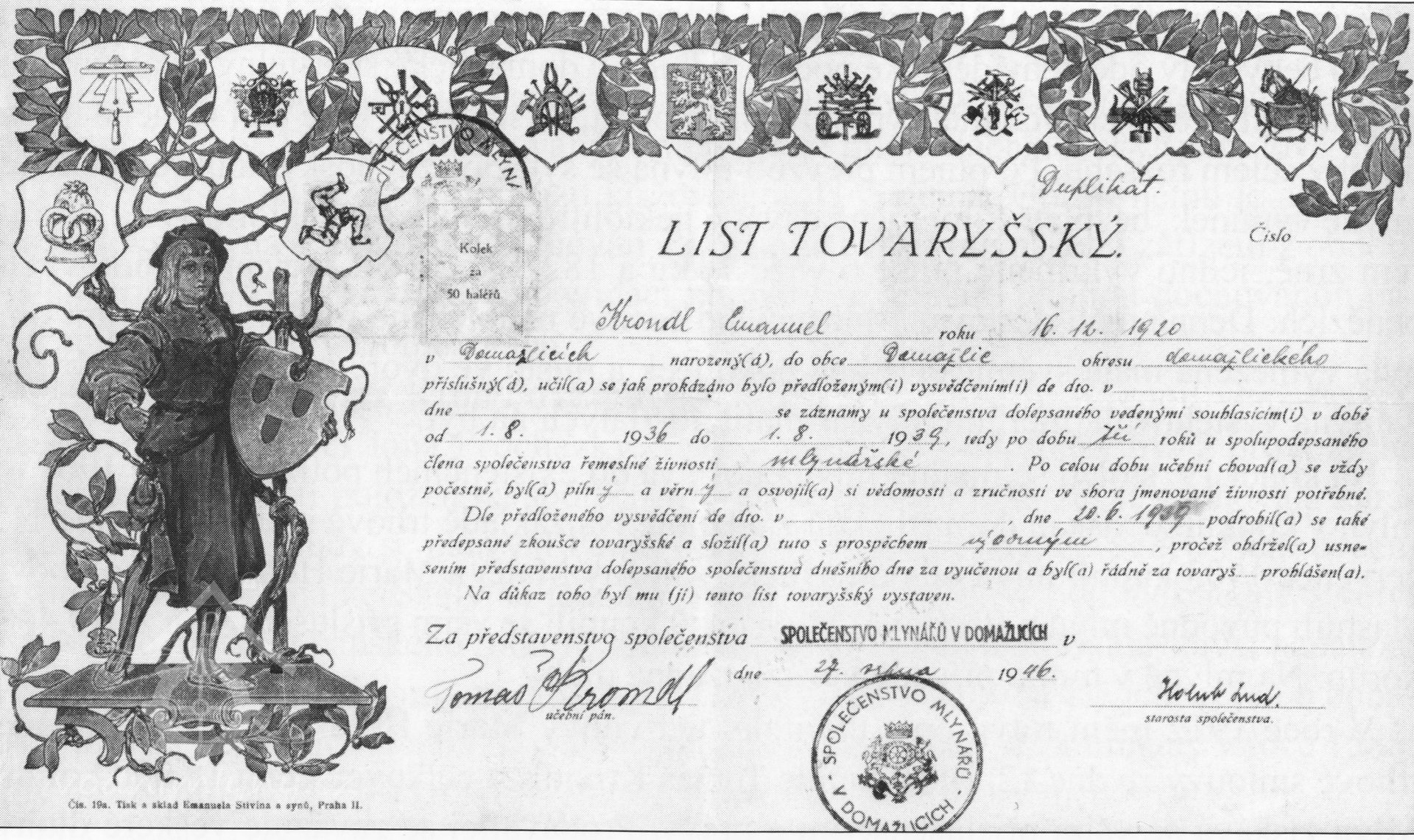 1940 Tomáš Krondl jedním z 5 členů společenstva domažlických mlynářů, kteří měli čistit stoku protékající městem