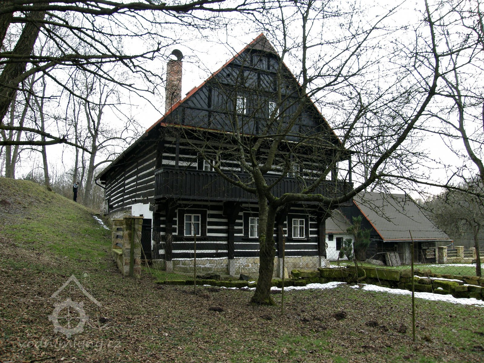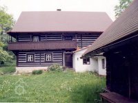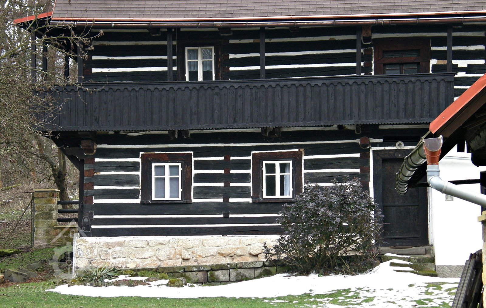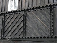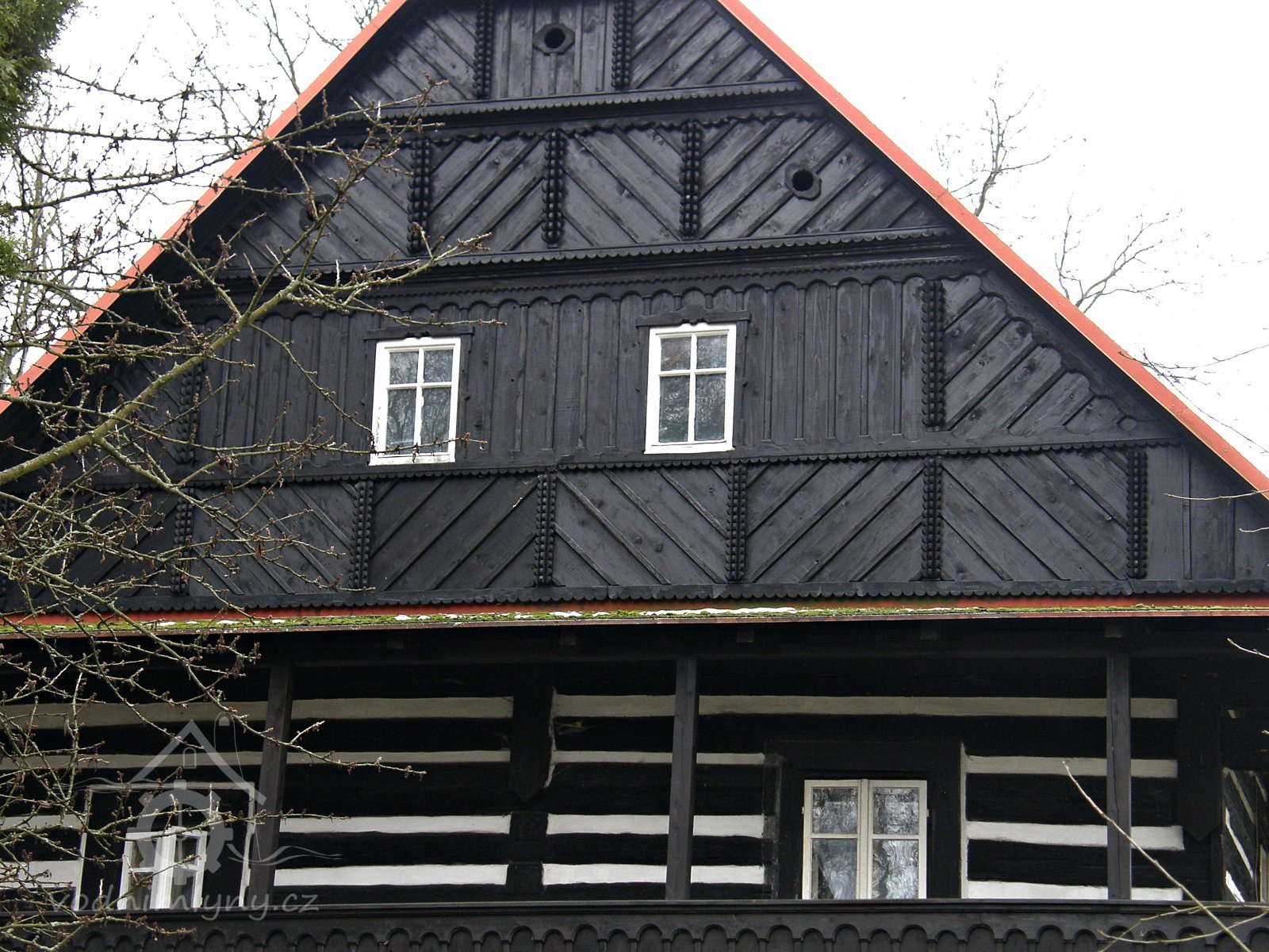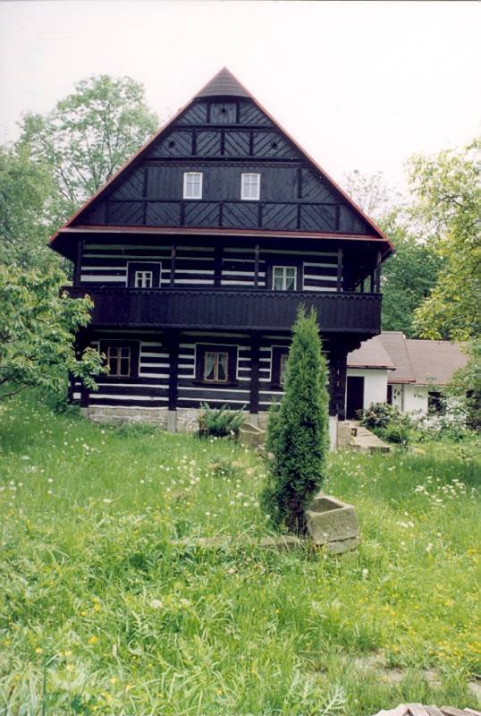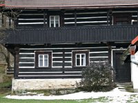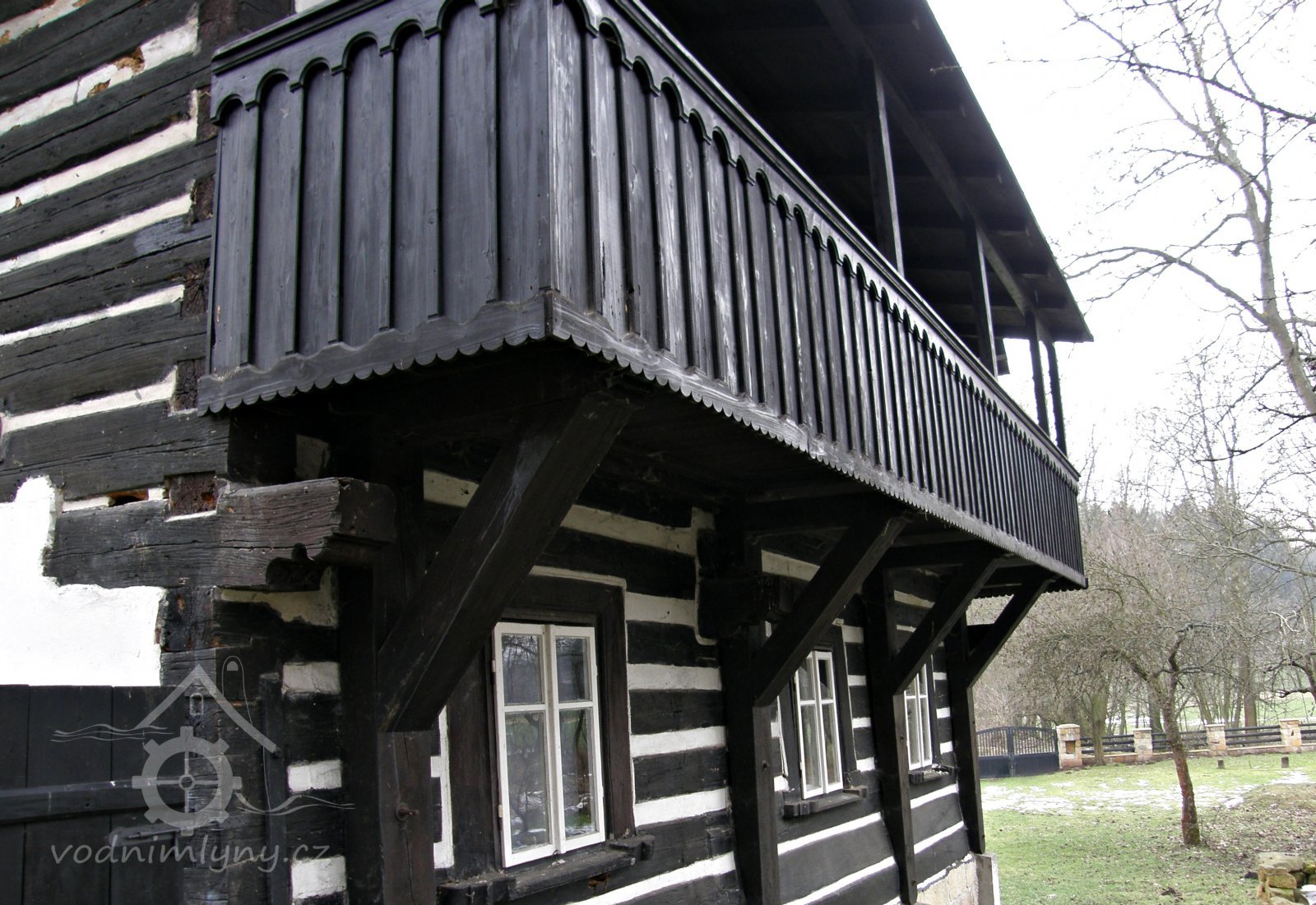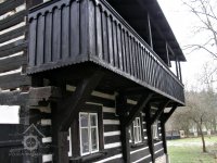 Roubená stavba s pavlačí a bohatě vyřezávanou lomenicí.