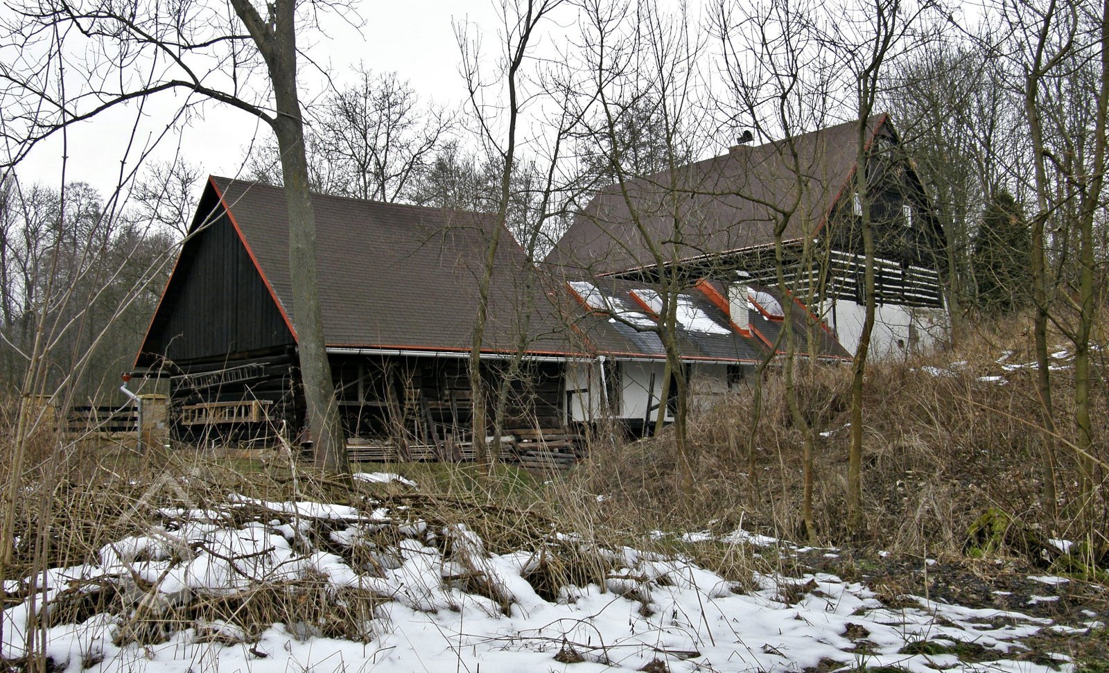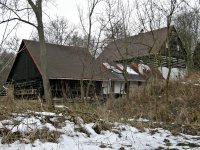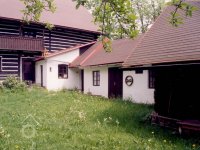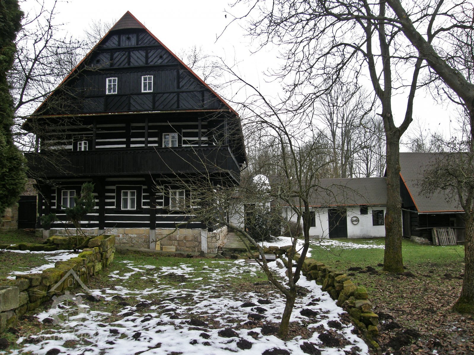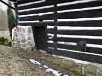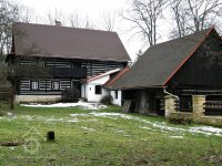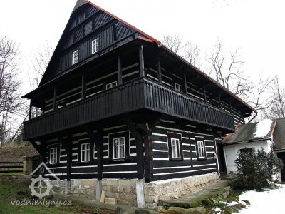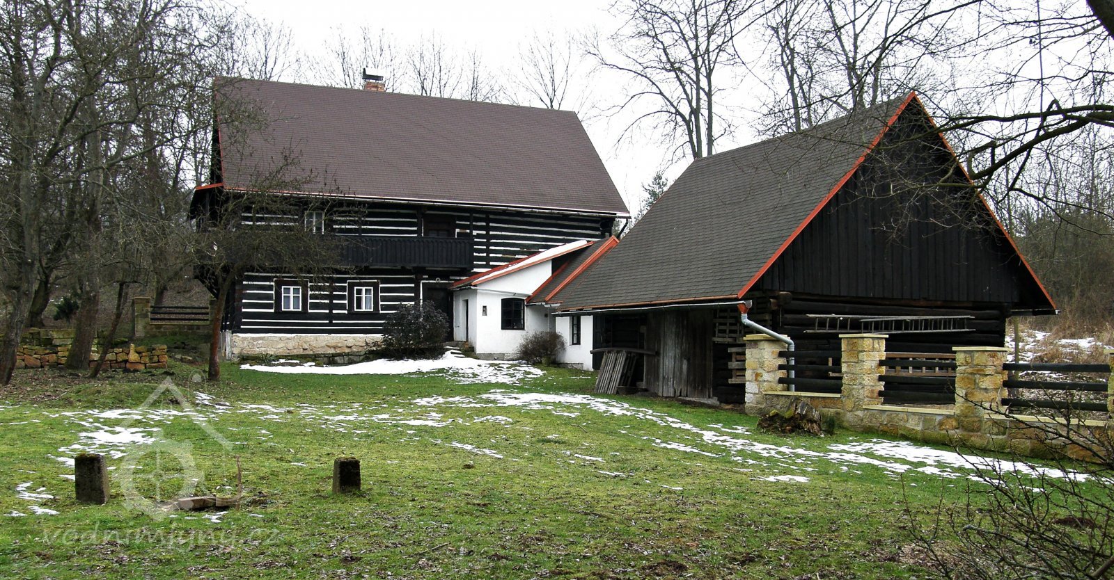 Výstavné roubené stavení mlýna s hospodářskými budovami a zachovalou lednicí.