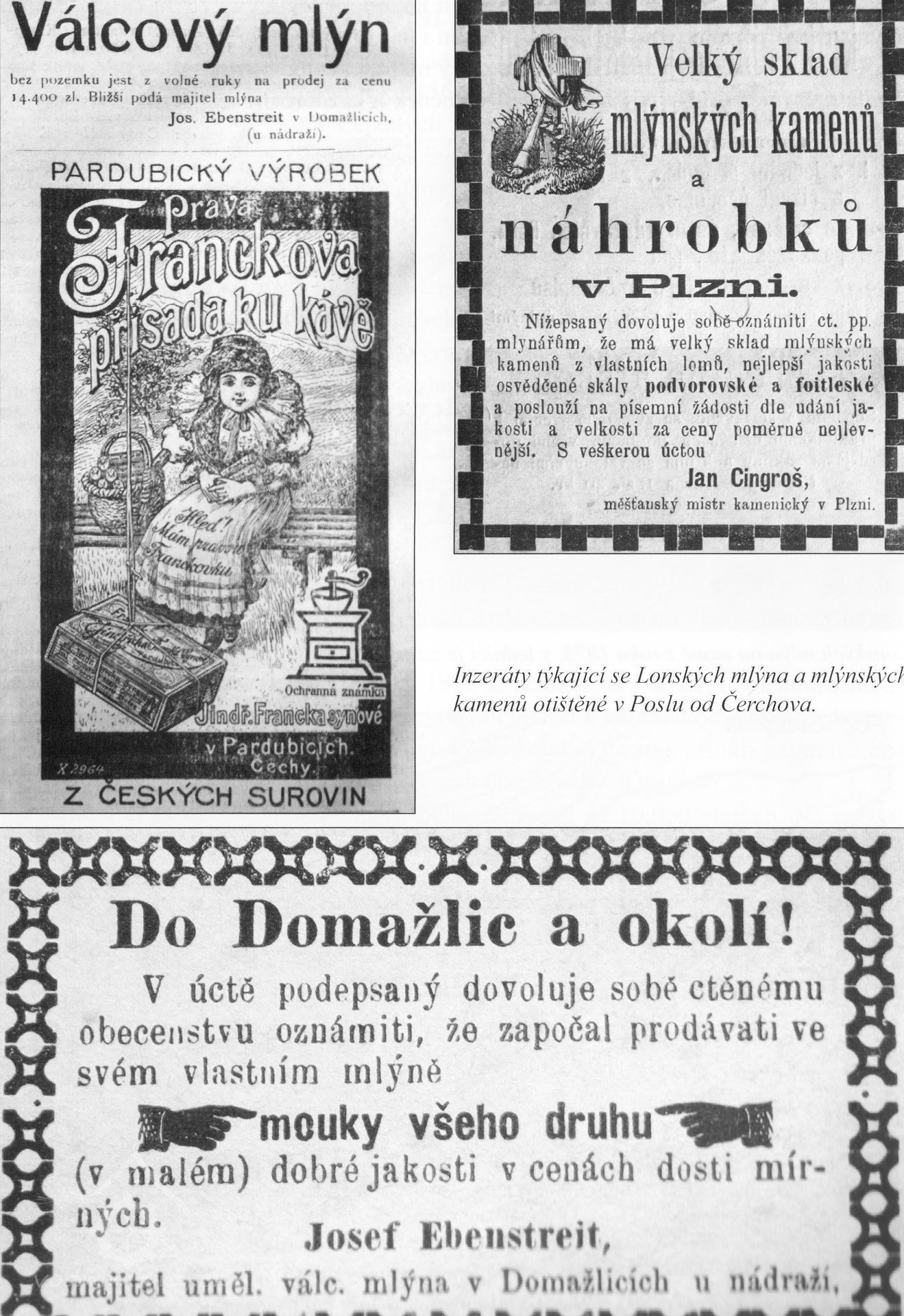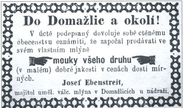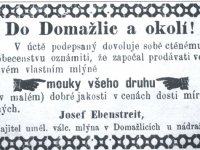 15.3.1876 Václav Ebenstreit s manž. Aloisií roz. Strecovou postupují mlýn synovi Josefovi za 10.000 zl., dluhy činí 654 zl.41 kr., na mlýně pár koní, 2 krávy, dřevěný a železný vůz. Rodičům musí zajistit výměnek, sestře věno a bratrům podíly.