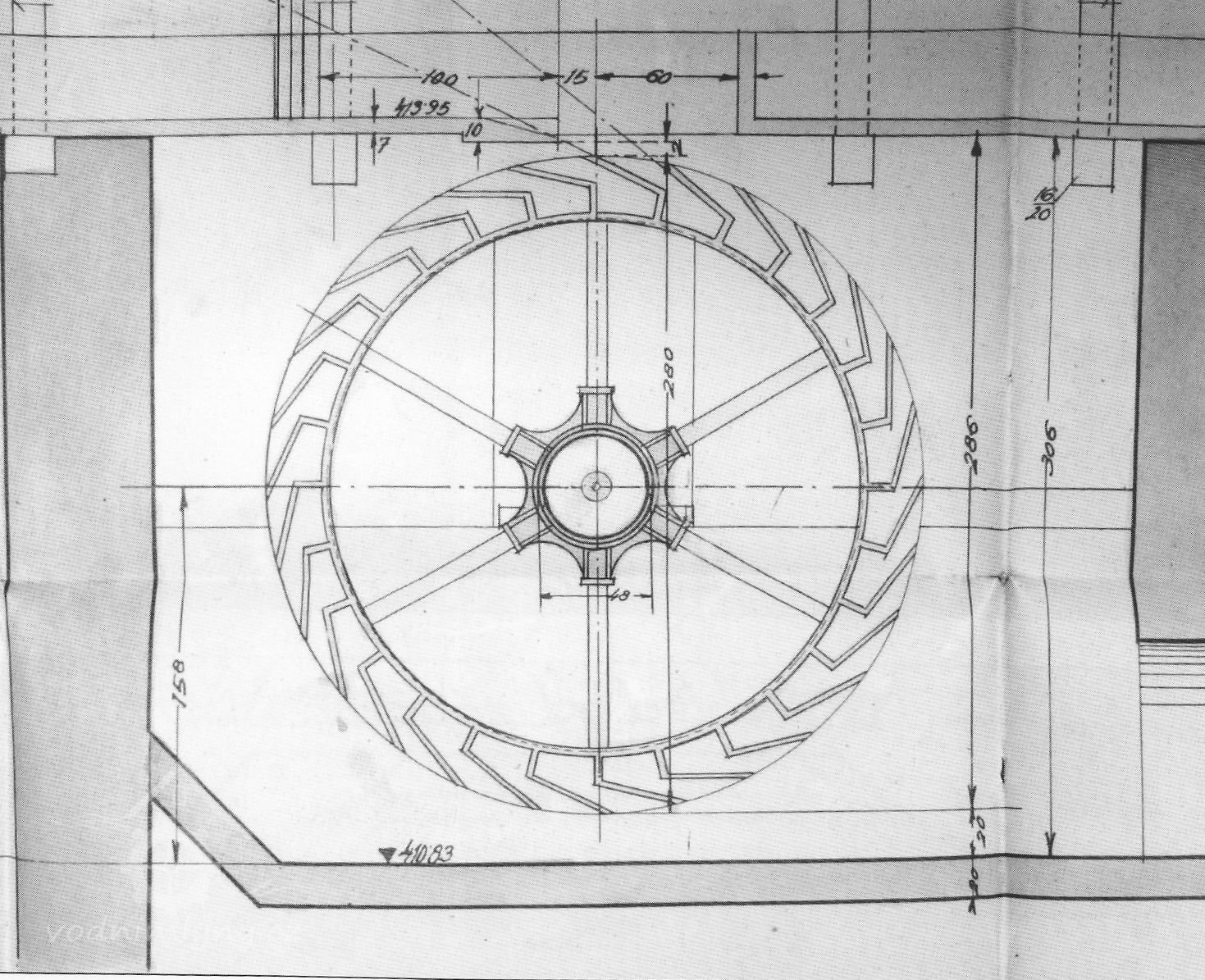 Zároveň byla původní dvě kola nahrazena jedním, usazeným již na kovové hřídeli jehož lopatky byly zakotveny do kovové růžice. Průměr kola dosahoval 2.8 m.