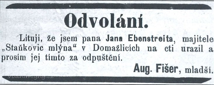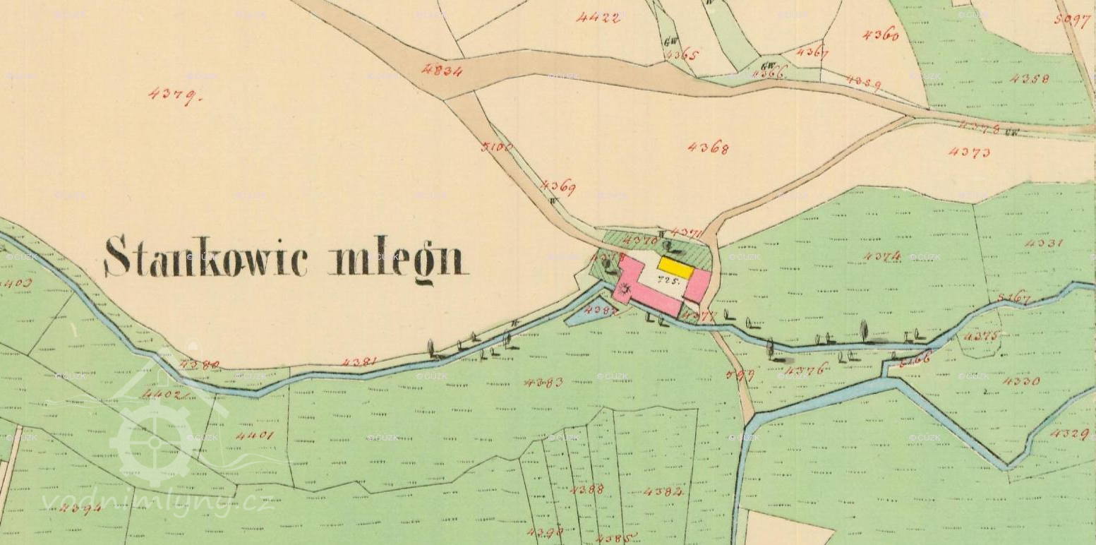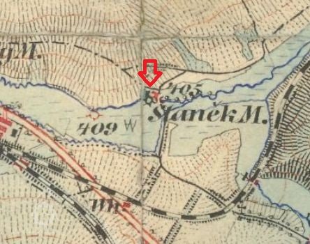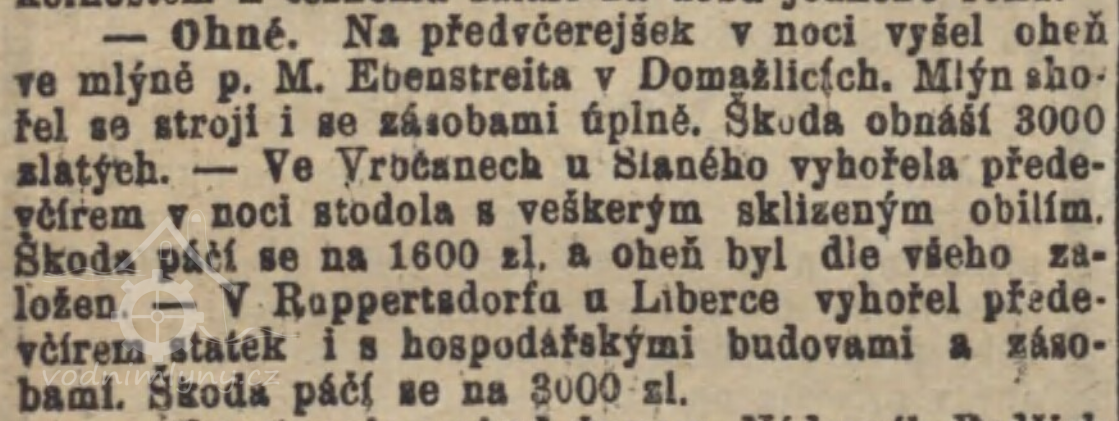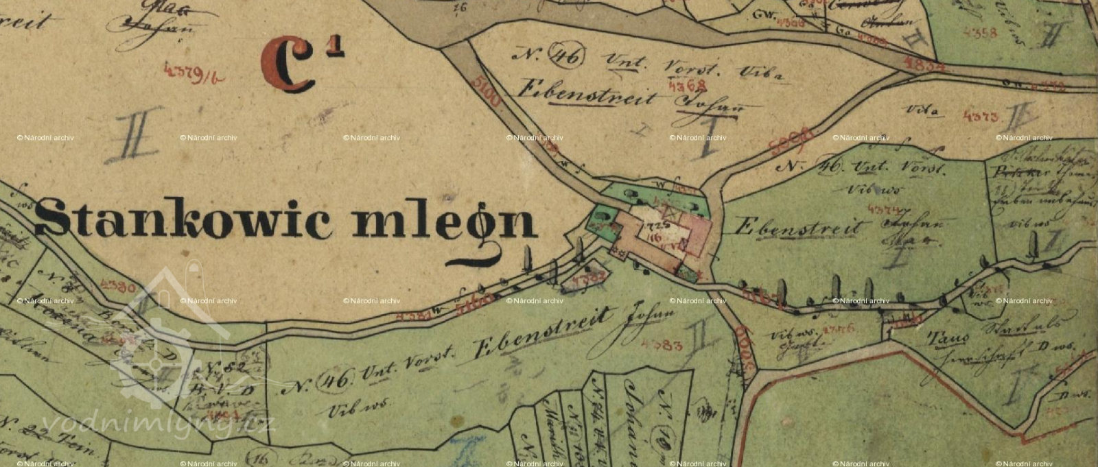 25. 10.1878 byl usazen vodní cejch. Majiteli mlýna byli tehdy Maxmilián a Anna Ebenstreitovi. Dvě česká složení tehdy poháněla dvě korečková kola o průměrech 4.4 a 4.8 m, vodu na ně přiváděly vantroky dlouhé 5.65 m.