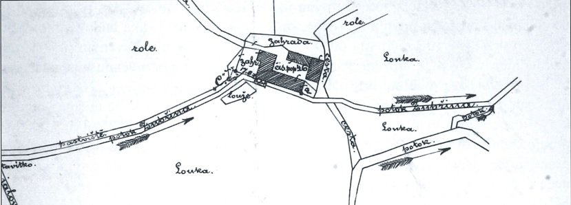 1838: 1 zděné stavby členitého půdorysu, uzavírající obdélný dvůr.