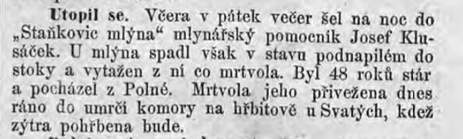 V 80. letech došlo ve mlýně k dvěma tragickým úmrtím. Roku 1885 se pádem z voru zabil pacholek Martin Kruml a roku 1888 se tu utopil mlynářský pomocník Josef Klusáček.