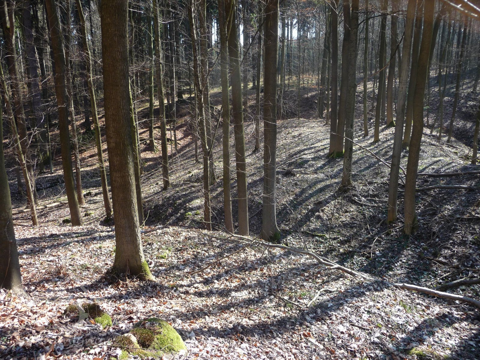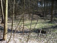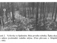 Zajímavý archeologický nález byl učiněn v zaniklé středověké vsi Ve spáleném, na katastrálním území obce Vyžlovka, jejíž počátky jsou kladeny do 13. století, přičemž zánik lokality je předpokládán na počátku 2. poloviny 14. století (Klápště 1978: 445–446). Nedaleko této zaniklé vsi, na samotě, byly na koruně hlinitojílovité hráze jednoho ze dvou menších rybníků s největší pravděpodobností objeveny relikty již zaniklého vodního mlýna (obr. 2). V reliéfu terénu zůstaly zachovány pozůstatky přívodu vody ke kolu na vrcholu hráze a boční koryto pro odvod přebytečné vody mimo mlýn. Archeologické výzkumy v letech 1999 až 2001 odkryly oboustranně lícované zídky z lomového kamene, které byly součástí tělesa hráze. Dle keramického materiálu získaného během povrchových sběrů a exkavace lze datovat založení mlýna do průběhu 2. poloviny 13. století, přičemž konec jeho funkce lze položit do průběhu 14. století, kdy zaniká celá ves. Na základě celkové situace na lokalitě a nízkého průtoku místní vodoteče je pravděpodobné, že se jednalo o mlýn na horní vodu. Tuto skutečnost však nelze jednoznačně prokázat (Klápště 1981: 435: 438; Maříková 2005: 98–100). Závěry však nekorespondují s výpovědí Luďka Štěpána o zavádění mlýnů s koly na horní vodu v polovině 14. století (Štěpán 2000: 55; Štěpán 2002: 12; Štěpán et al. 2008: 151).