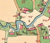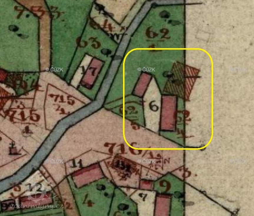 1852: Potok Stebenka ma pravém břehu. Jez ležatý, 4 sáhy dlouhý, dva sáhy široký. 1 střevíc hluboký. Z toho jezu vede beze všech stavidel můlýnská strouha od jezu až jke mlýnu. Náhon: 200 sáhů dlouhý, 12/2 sáhu široký, 1/2 - 1 sáh hloubky. Od mlýna vede do jalového potoka 7 sáhů dlouhá klenutá štola.