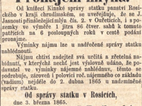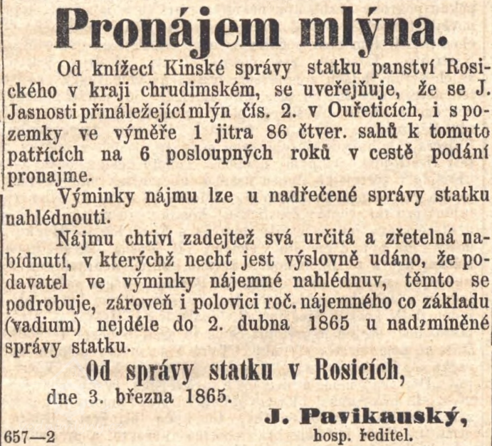 Mlýn byl v r. 1865 nabízen k pronájmu na 5 let. Majetek knížat Kinských. (RR)