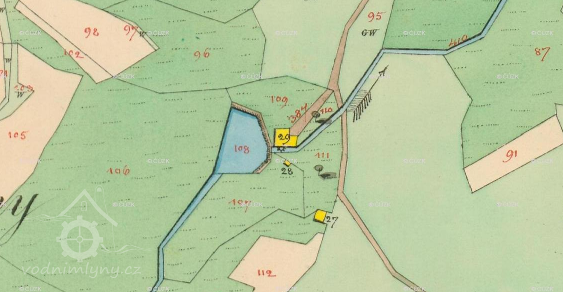 PopisV roce 1930 mlýn pohánělo 1 kolo na svrchní vodu, průtok 0.17 m3/s, spád 3.2 m, výkon 4.8 HP