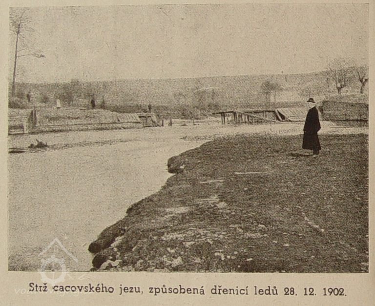 Nyní několik dalších dat o cacovském mlýně a to z článku, uveřejněného v listech r. 1903 pod nadpisem. "Strž vodního jezu v Cacovicích u Brna." Po tuhých mrazích v listopadu a prosinci r. l902 nastalým odměkem rozvodnila se řeka Svitava tou měrou, že pozvedla obrovské a silné kry a odnášejíc je na své hladině, mnoho mlýnů a jezů ve svém řečišti postavených, více méně poškodila. Neblahý osud ten potkal dne 28. prosince 1902 též jez u Maloměřic, náležející spolu s cacovským mlýnem panu Ferdinandu a Otýlii Frankovým. Ze starých listin, chovaných v cacovském mlýně, vyjímáme několik údajů splavu se týkajících. Postaven byl druhým majitelem mlýna, Eduardem Rybou na místě starého, za jara r. 1830 jarní vodou a kry urvaného. Prvým po vrchnosti majitelem mlýna a jezu byl Antonín Svoboda, který koupil mlýn s nějakým pozemkem, zahradou a vším mlýnským příslušenstvím podle inventáře od kláštera králové Sv. Marie Saal na Starém Brně. Od Ryby, vlastně jeho zástupců, koupil mlýn Josef Kottoweetz a od syna tohoto, Eduarda Kottowetze, r 1884 nynější majitelé Ferdinand a Otýlie Frankovi.