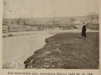 Po výstavbě betonového splavu a zaplnění vodou do normální výše zjištěna při hrázi na pravém břehu v ohbí divoké řeky nad ledovou zbraní hloubka až půlčtvrtého metru.