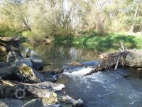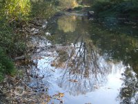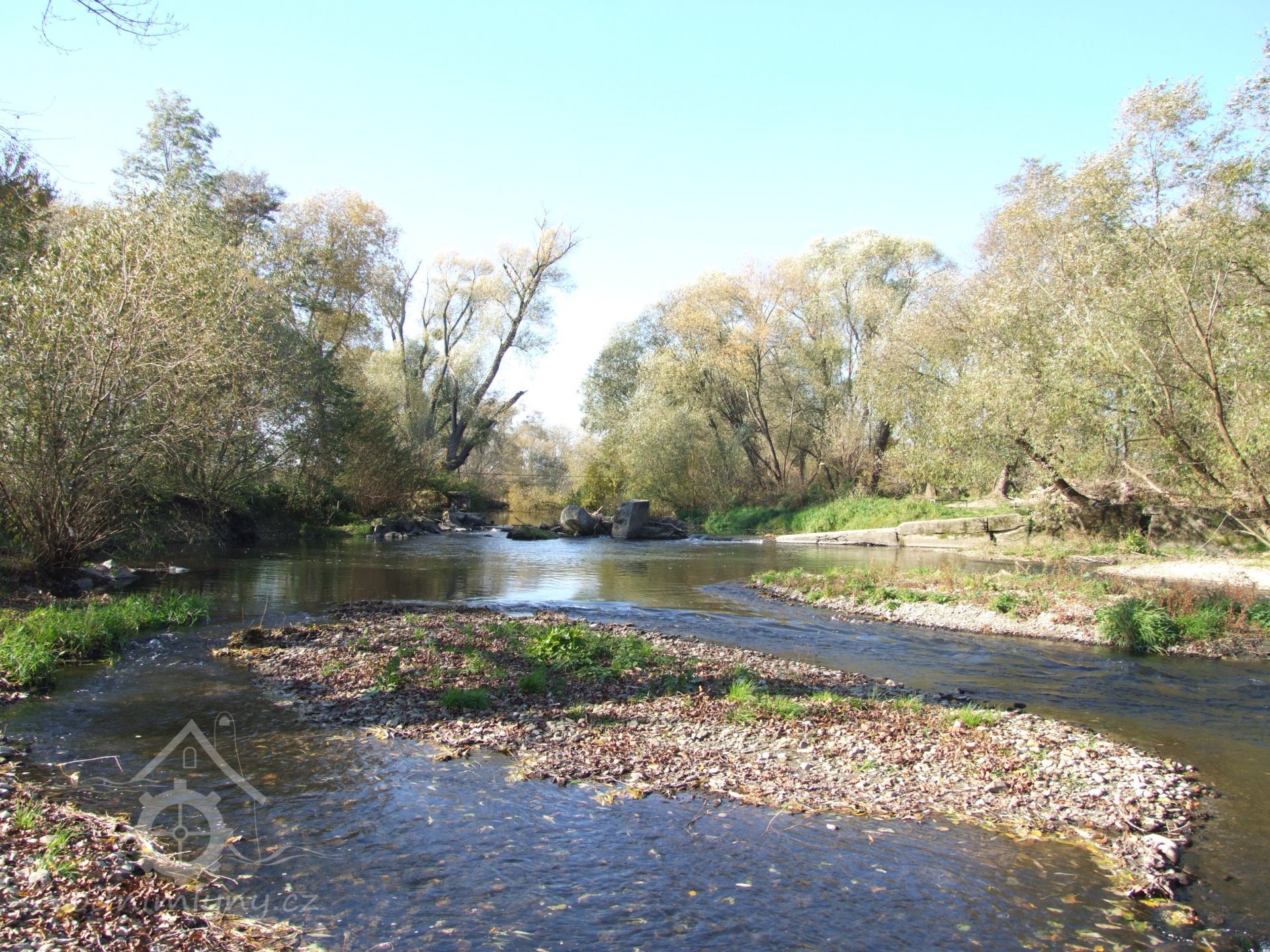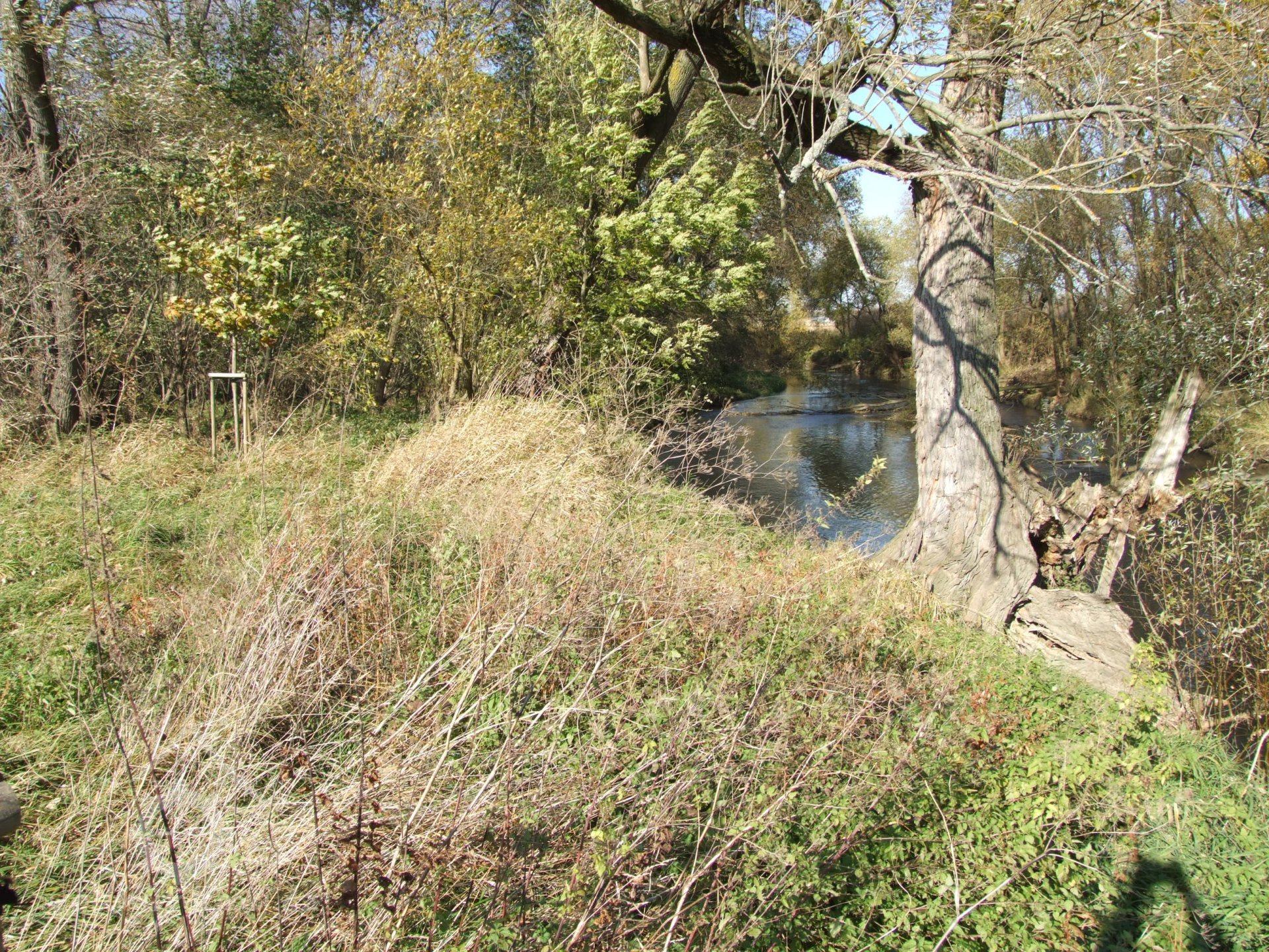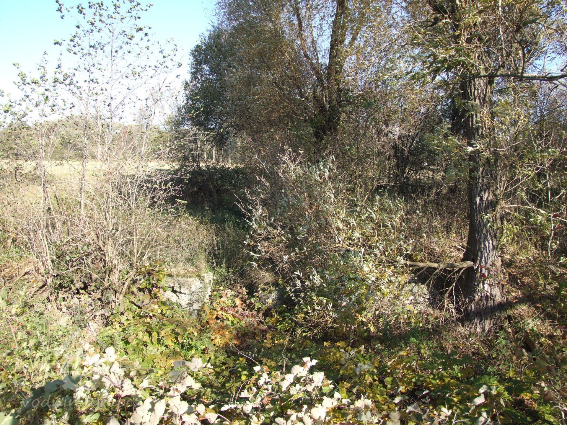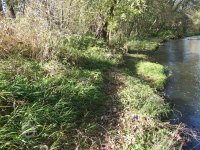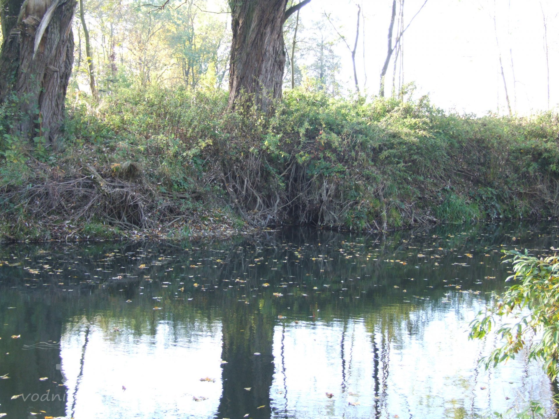 Mlýn Na Závodí č.p. 105, Holasovice – vodní právo: 'jalový odpad', spíše vracečka, již dnes vůbec neexistuje a trasu možno poznat jen dle historických specializovaných vodohospodářských map a pak v terénu podle nich jít a neuhnout. Koryto bylo uprostřed fotografie (fotografováno po vodě), říjen 2021, © Jiří Hořák, (Prvky na obrázku: náhon)