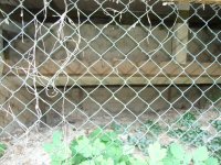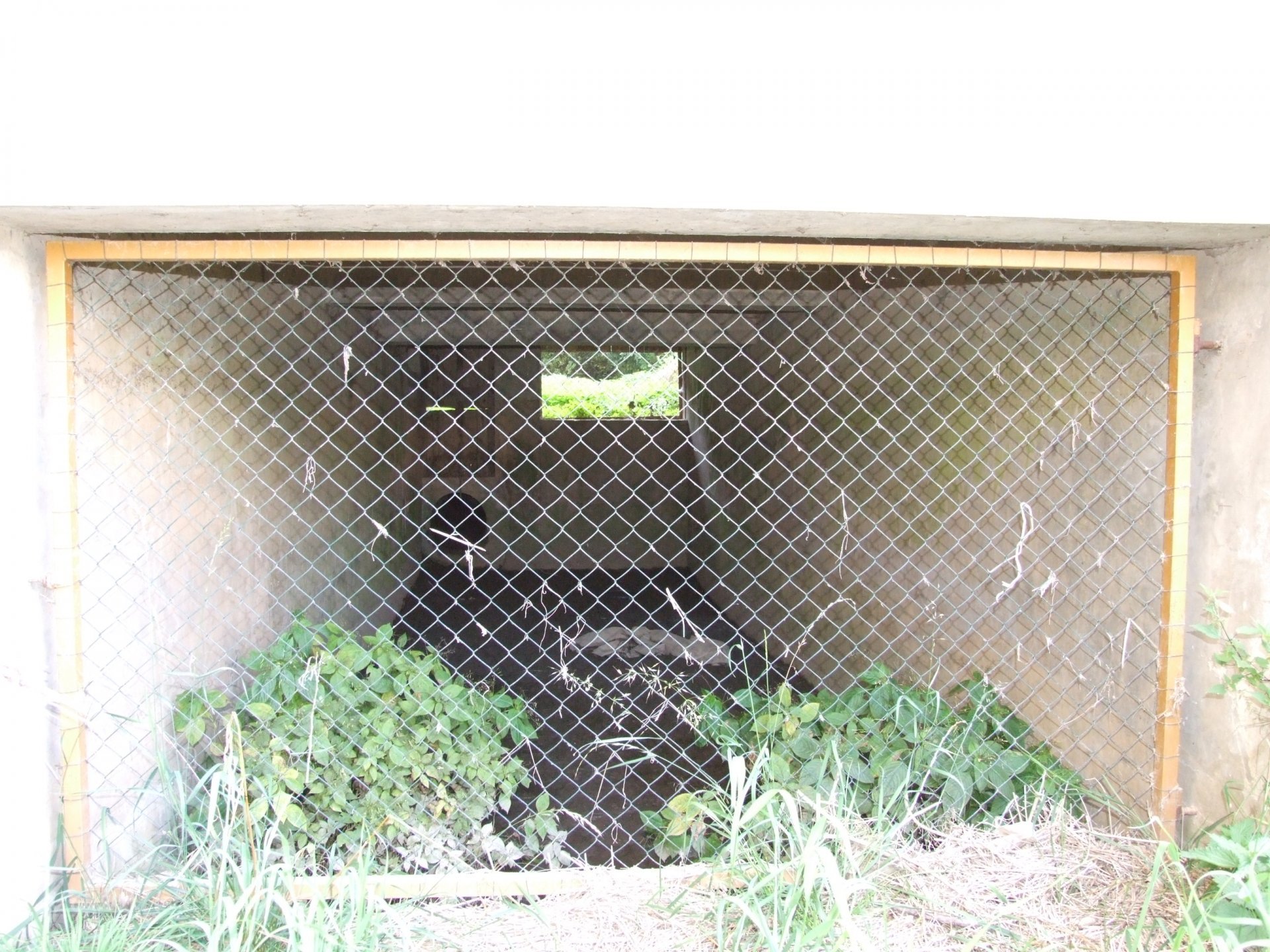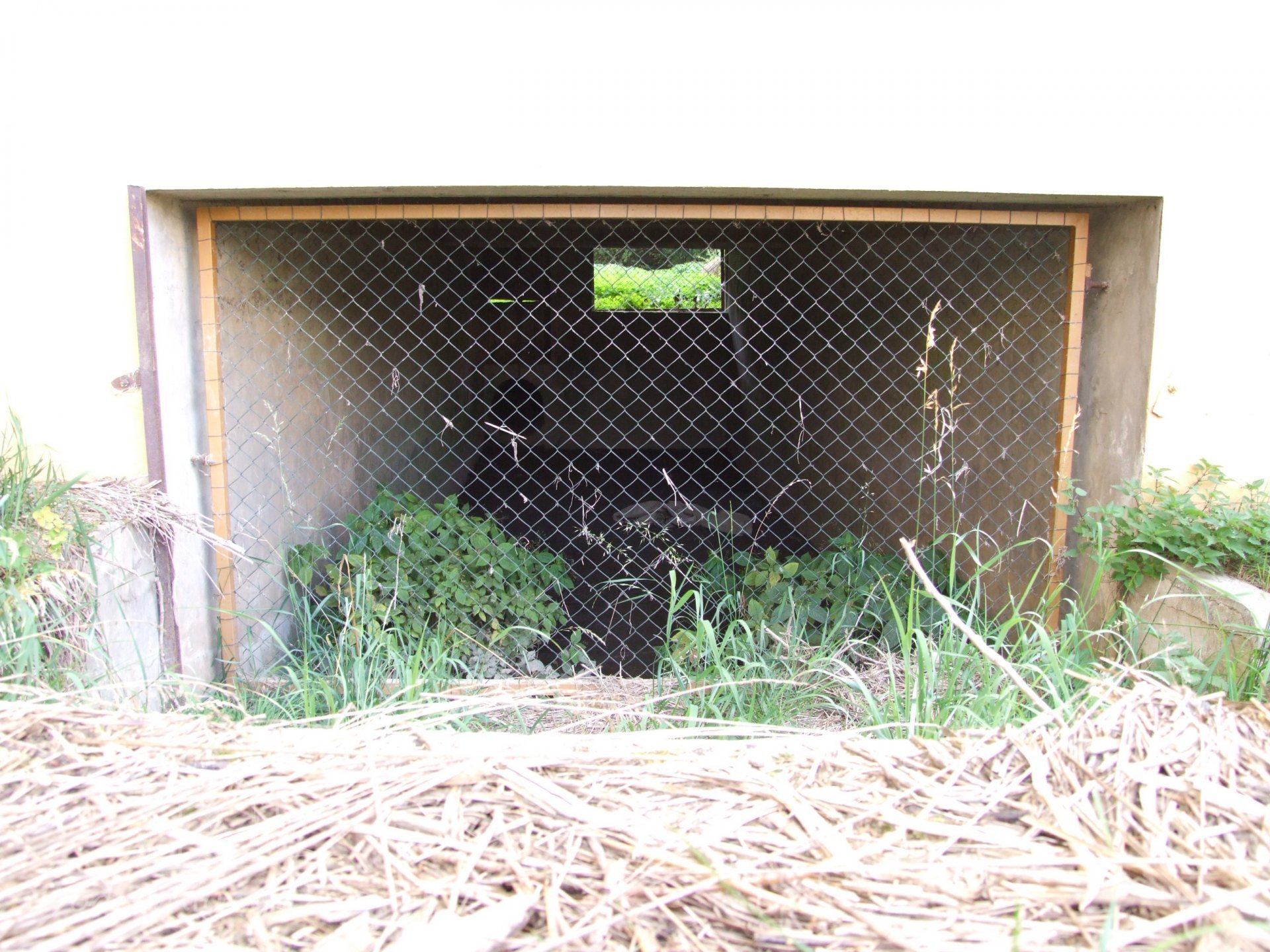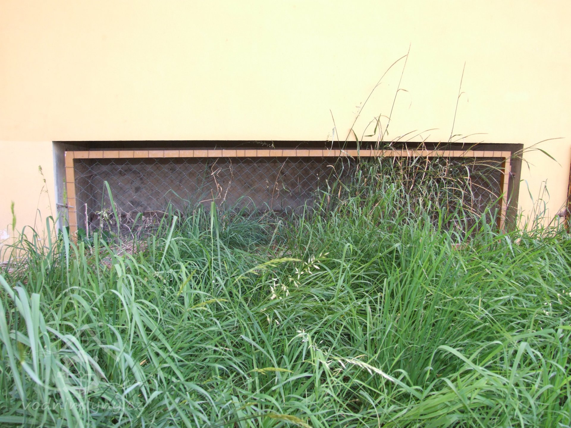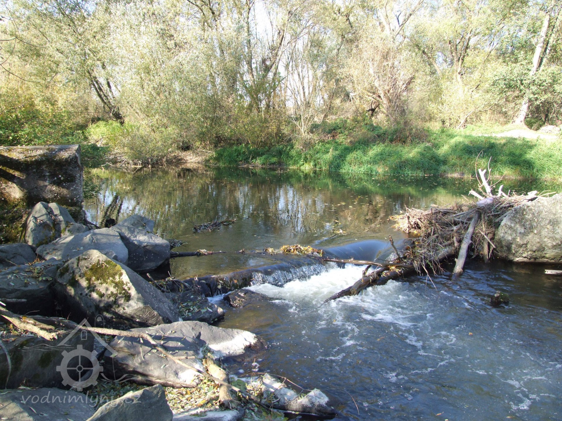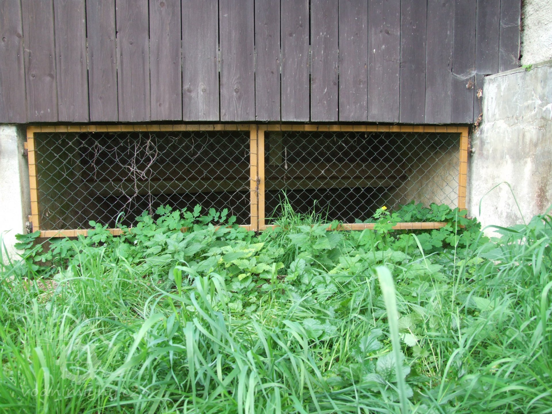 Mlýn Na Závodí č.p. 105, Holasovice – vodní právo: detail na vlevo hrazenou část jalového obtoku turbínové kašny turbínového domku v km náhonu 0,316; vpravo nehrazenou část téhož (fotografováno proti vodě), září 2021, © Jiří Hořák, (Prvky na obrázku: jalový žlab, turbínový domek)