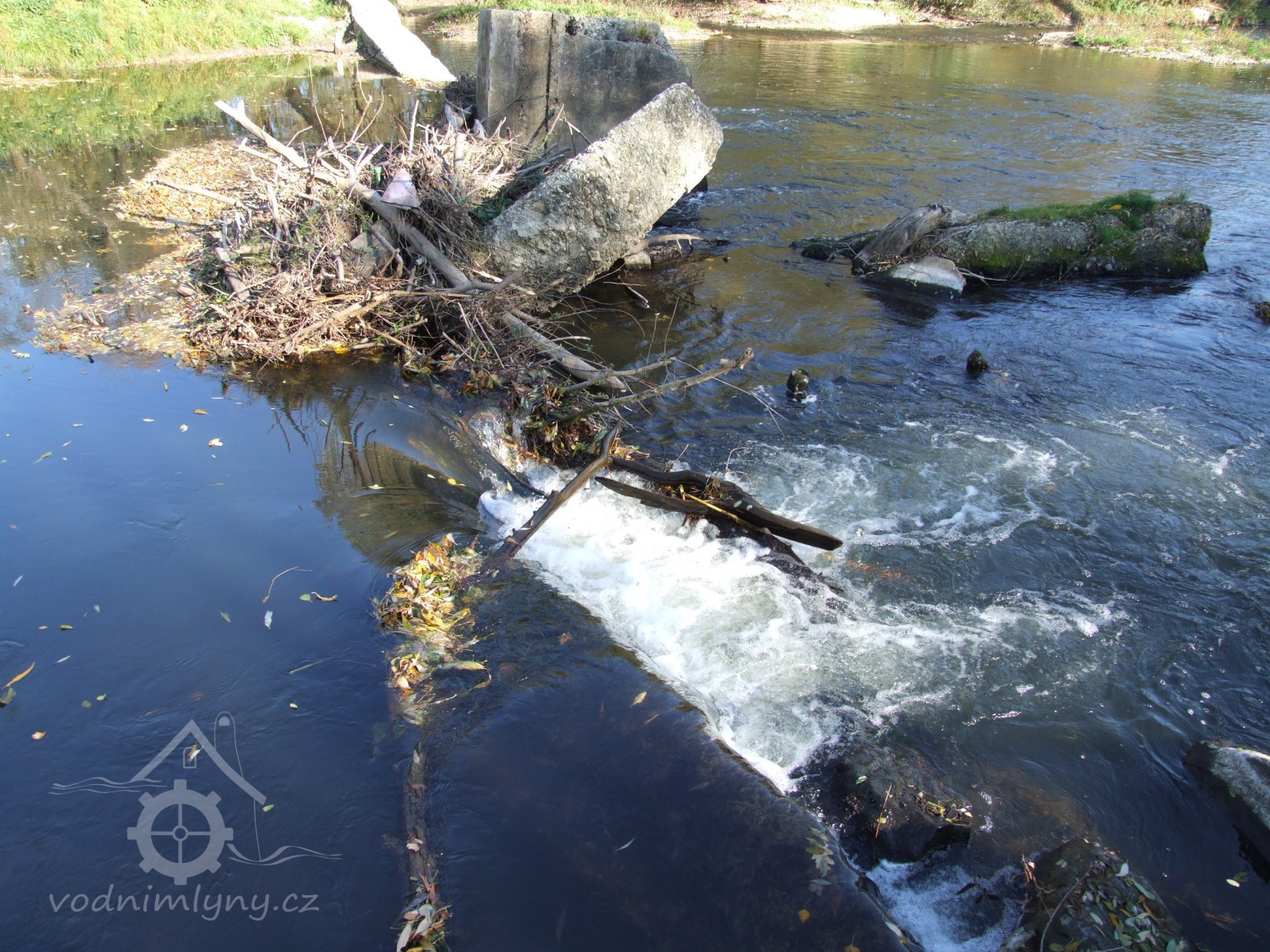 Mlýn Na Závodí č.p. 105, Holasovice – vodní právo: detail stavidla hrazené části jalového obtoku turbínové kašny turbínového domku v km náhonu 0,316 (fotografováno po vodě), září 2021, © Jiří Hořák, (Prvky na obrázku: stavidlo, turbínový domek)