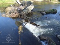 Mlýn Na Závodí č.p. 105, Holasovice – vodní právo: protržený Červený jez v ř. km 51,569 řeky Opavy, ovšem na této straně břehu se již jmenuje Opawa, protože pozor!!!: Pozor! Státní hranice probíhají hraničním vodním tokem/Uwaga! Granica Państwa przebiega środkiem rzeki (voda protéká zprava doleva), říjen 2021, © Jiří Hořák, (Prvky na obrázku: jez)