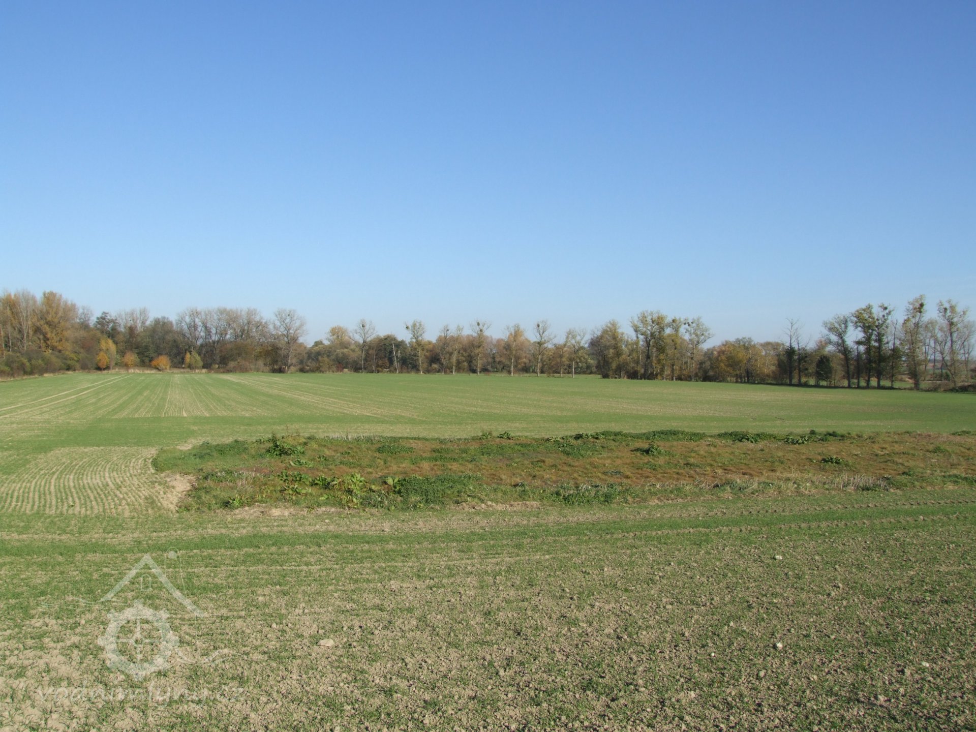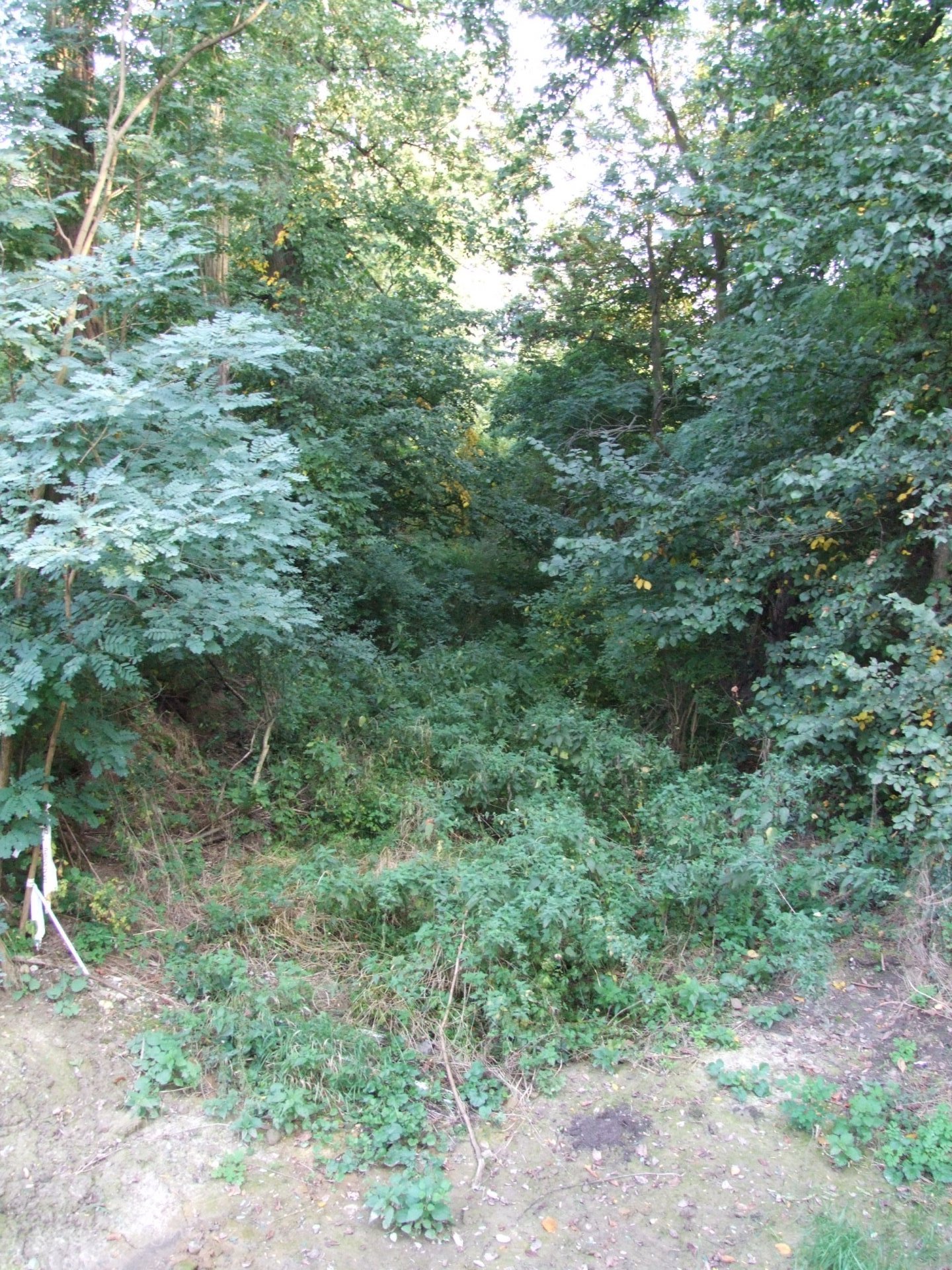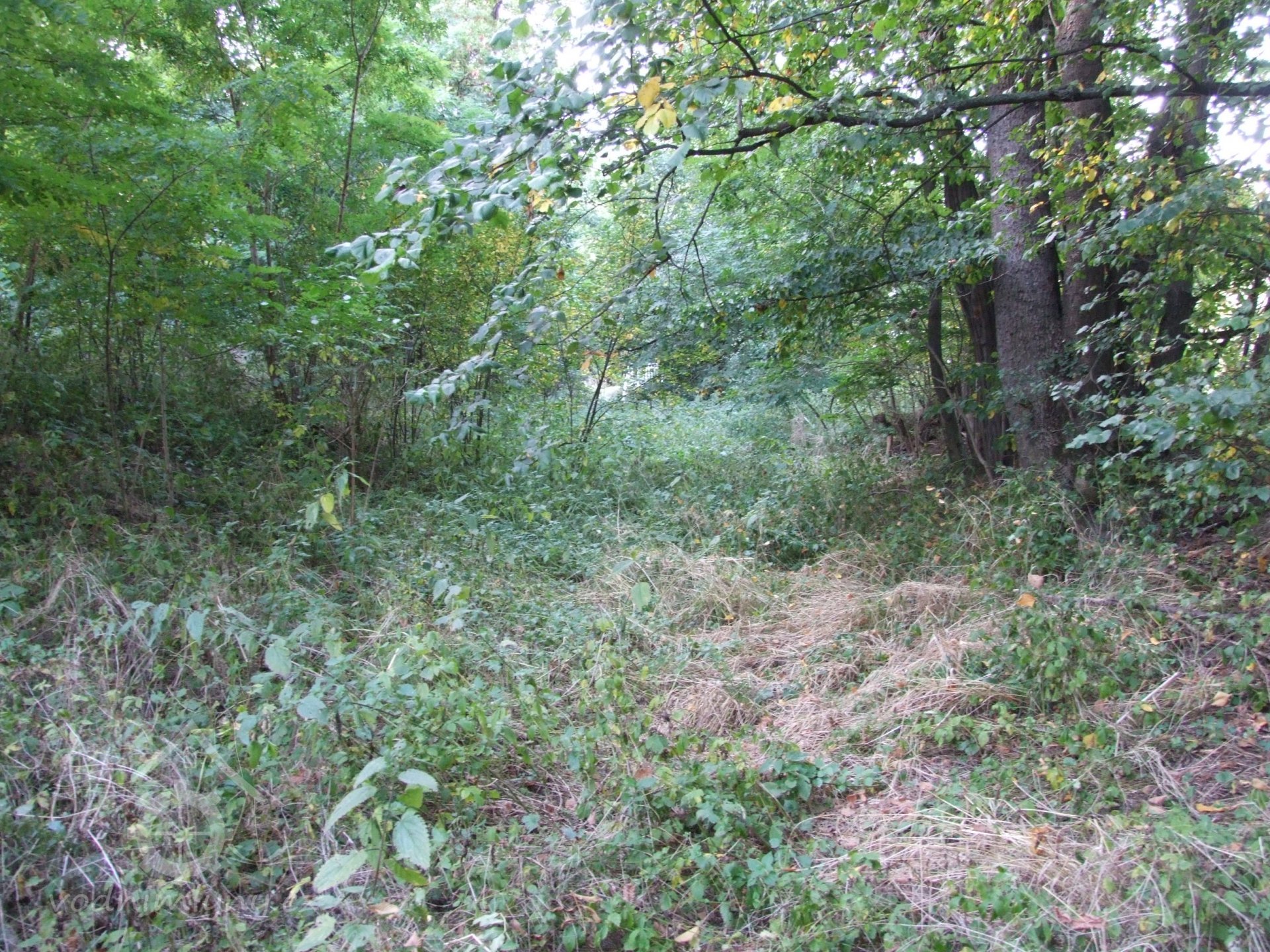 Mlýn Na Závodí č.p. 105, Holasovice – vodní právo: 'jalový odpad', spíše vracečka, již dnes vůbec neexistuje a trasu možno poznat jen dle historických specializovaných vodohospodářských map a pak v terénu podle nich jít a neuhnout. Koryto bylo uprostřed fotografie (voda protékala zleva doprava), říjen 2021, © Jiří Hořák, (Prvky na obrázku: jalový žlab)