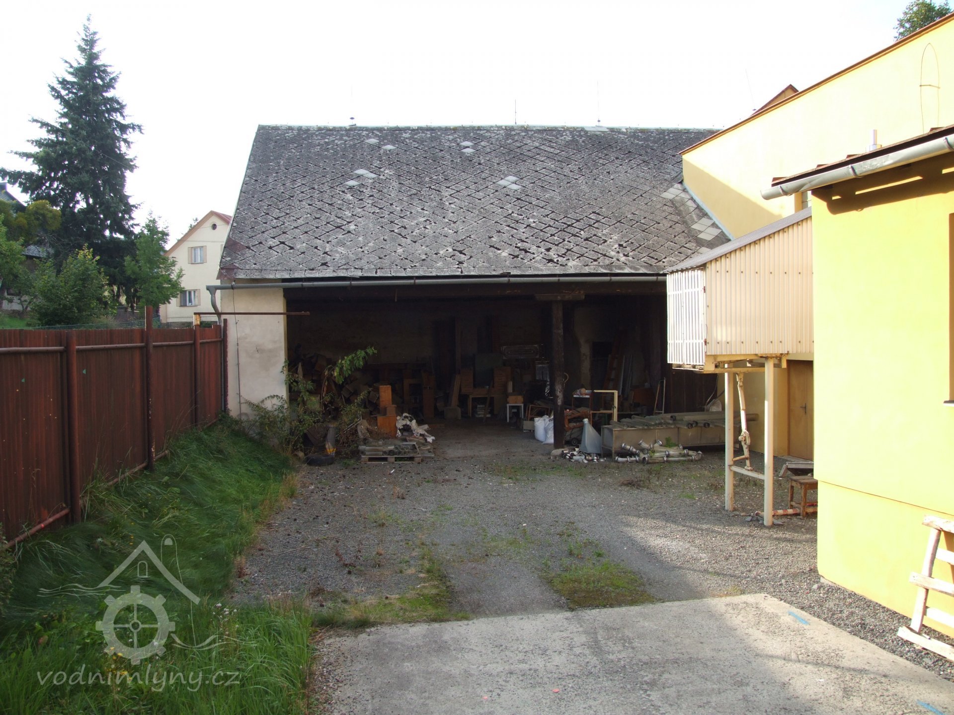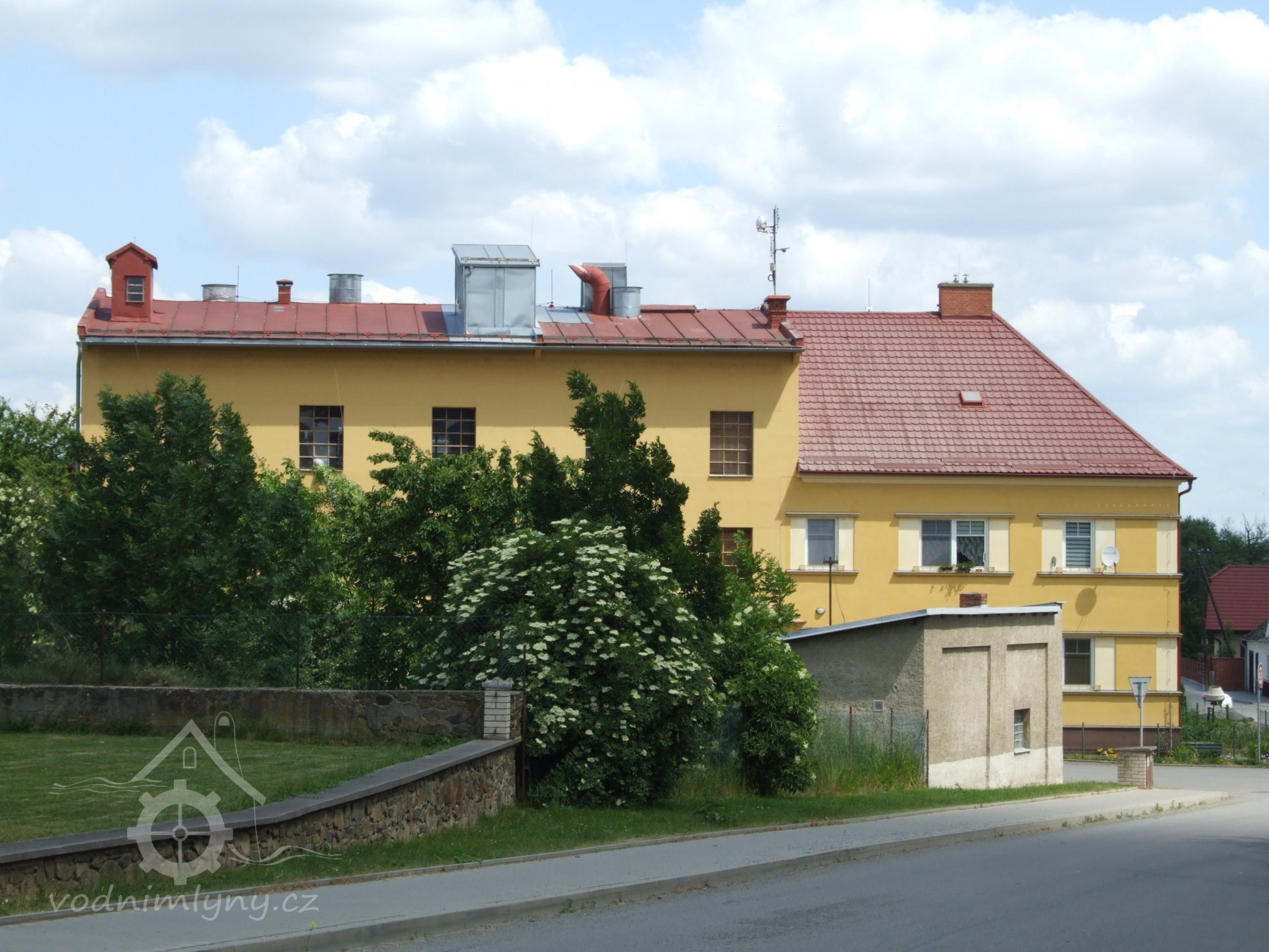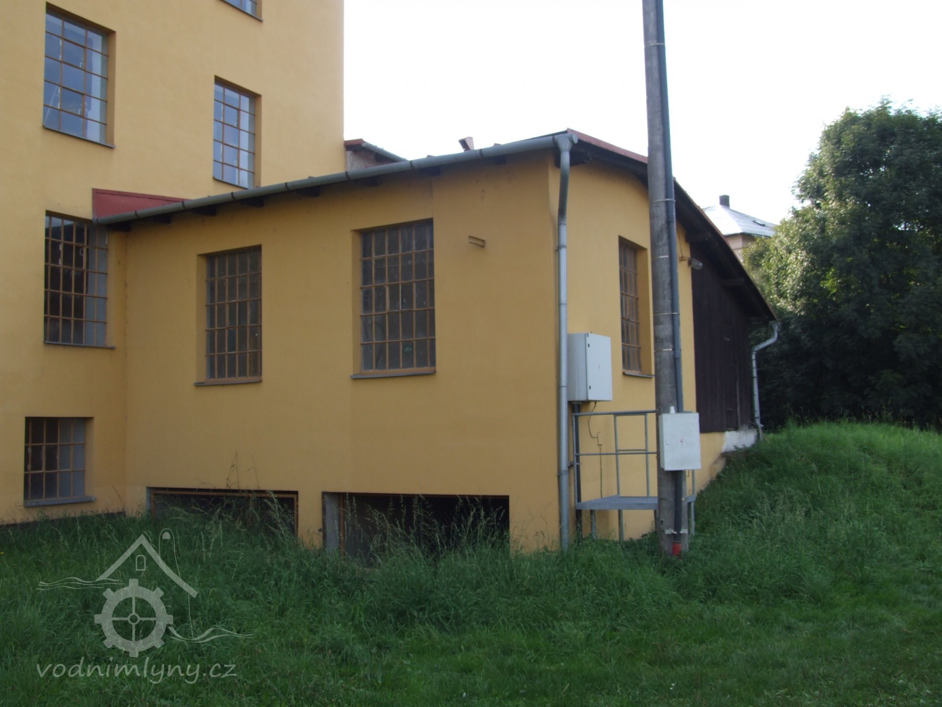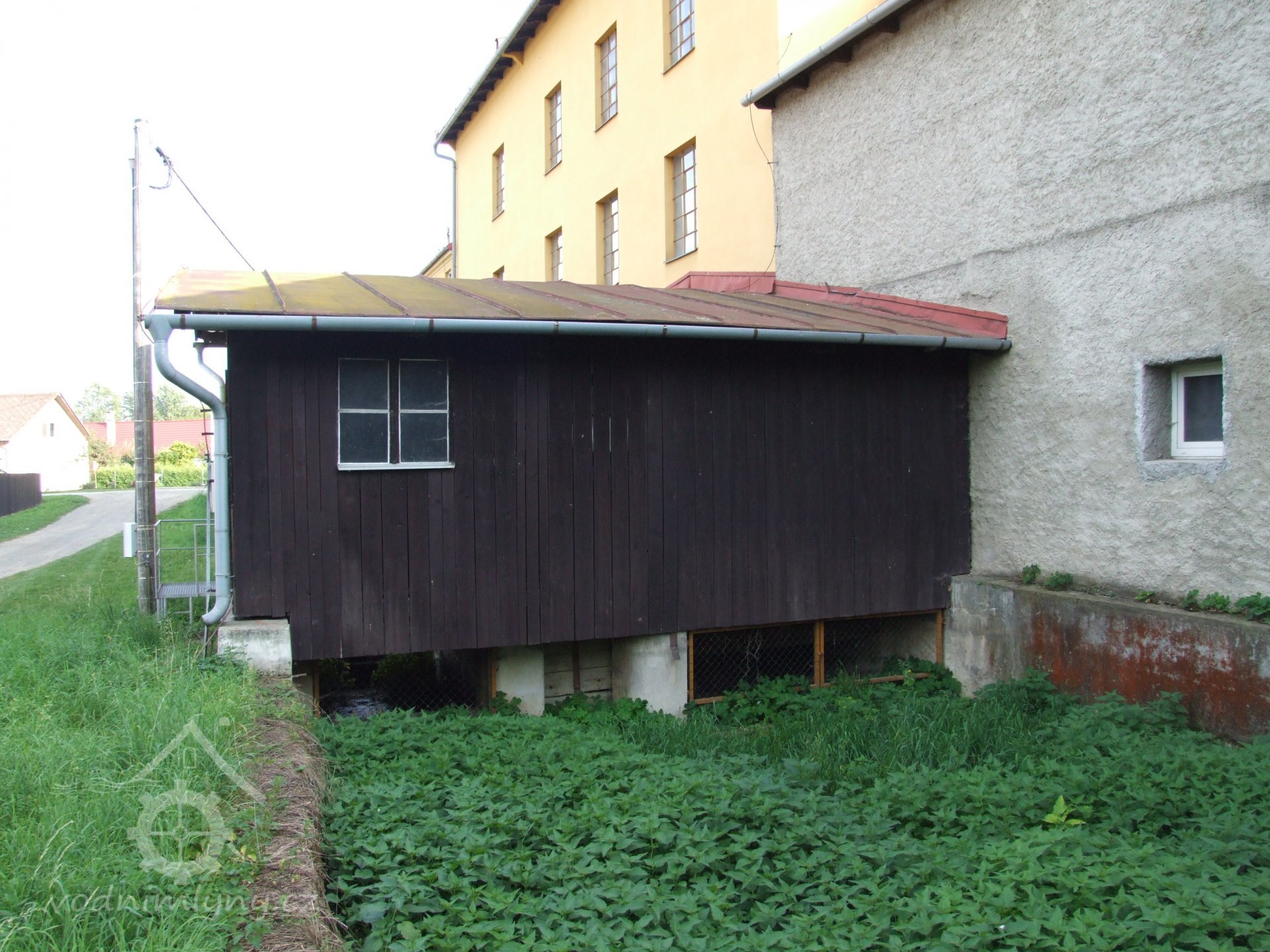 Mlýn Na Závodí č.p. 105, Holasovice – návodní strana turbínového domku, červen 2023, © Jiří Hořák, (Prvky na obrázku: Turbína)