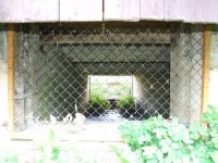 Mlýn Na Závodí č.p. 105, Holasovice – vodní právo: vtok do turbínové kašny turbínového domku v km náhonu 0,316 (fotografováno po vodě), září 2021, © Jiří Hořák, (Prvky na obrázku: turbínový domek, odtokový kanál)