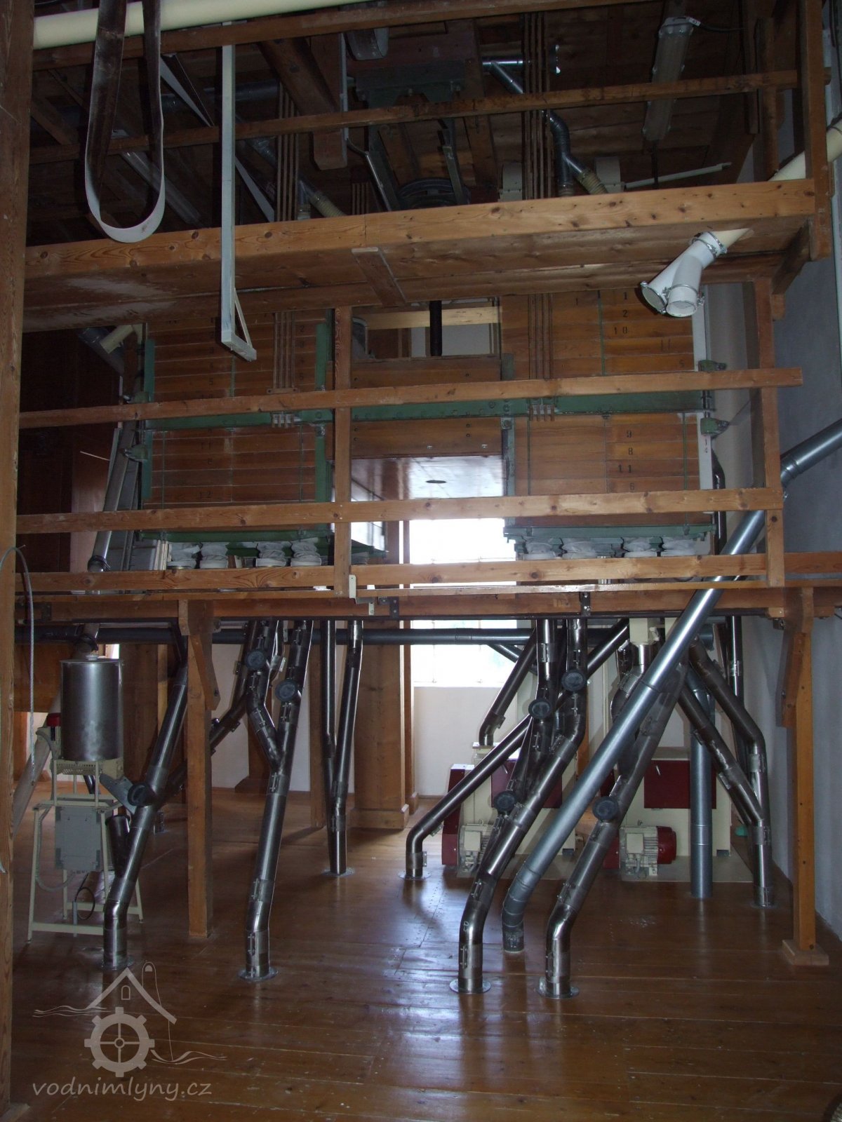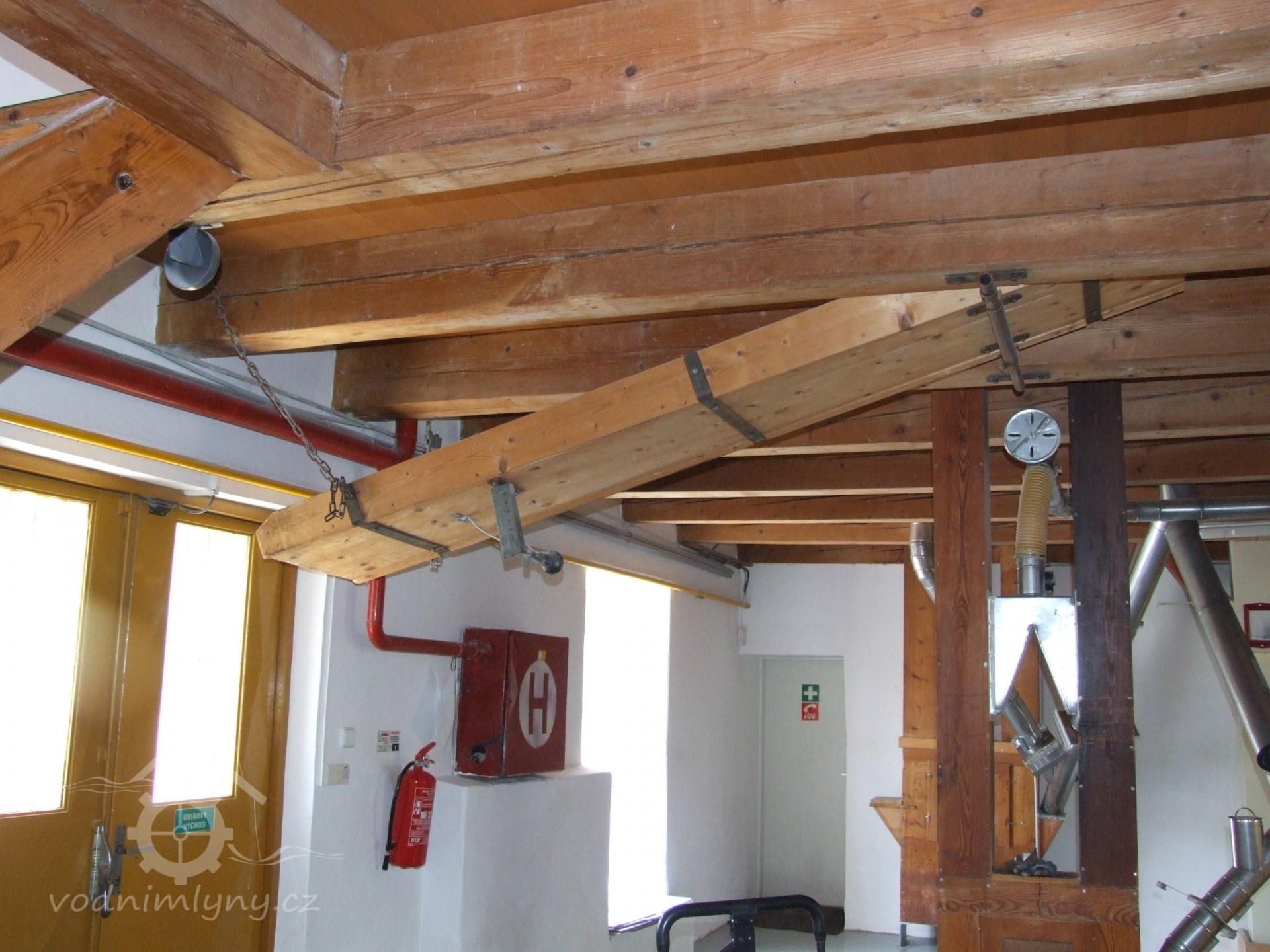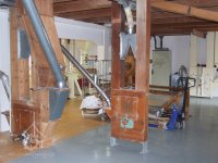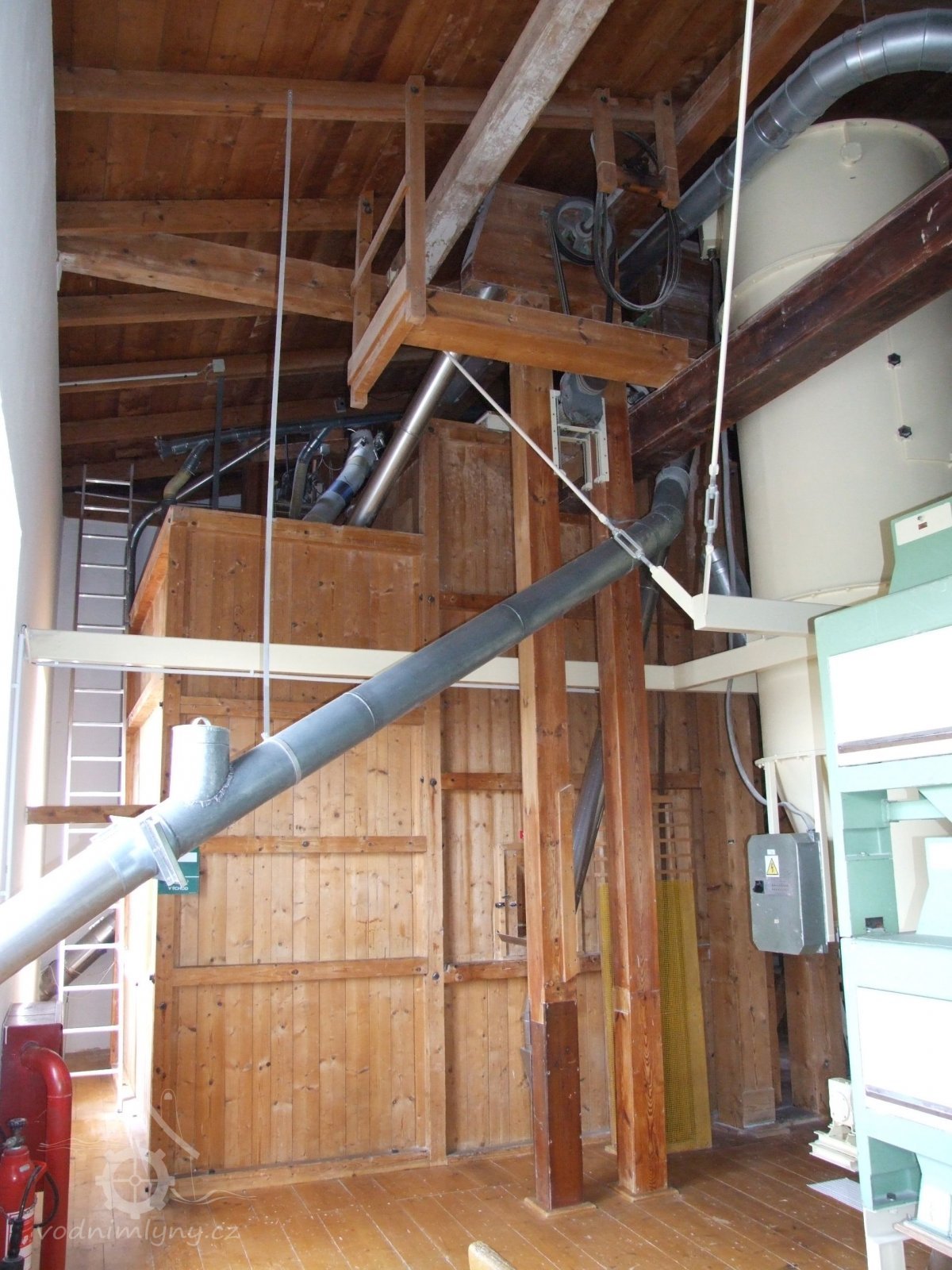 Mlýn Na Závodí č.p. 105, Holasovice – přízemí: celkový pohled; kapsové výtahy původní i moderní, červen 2023, © Jiří Hořák, (Prvky na obrázku: výtahy a dopravníky)