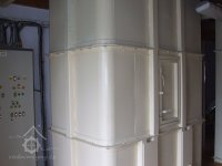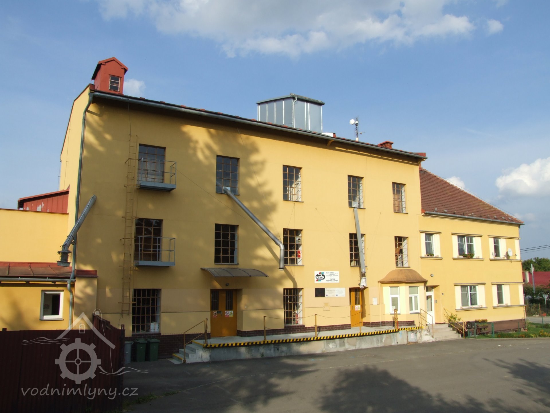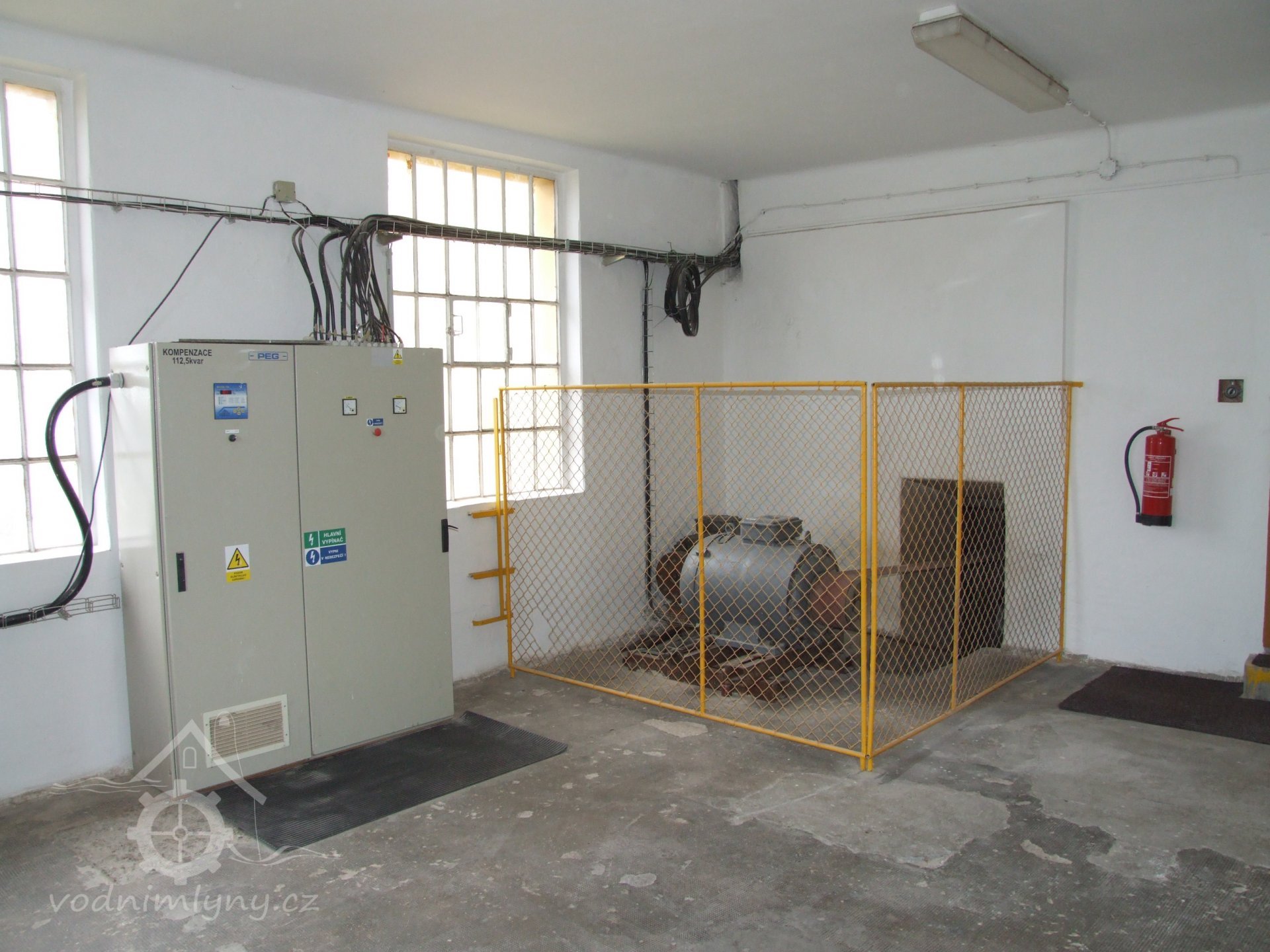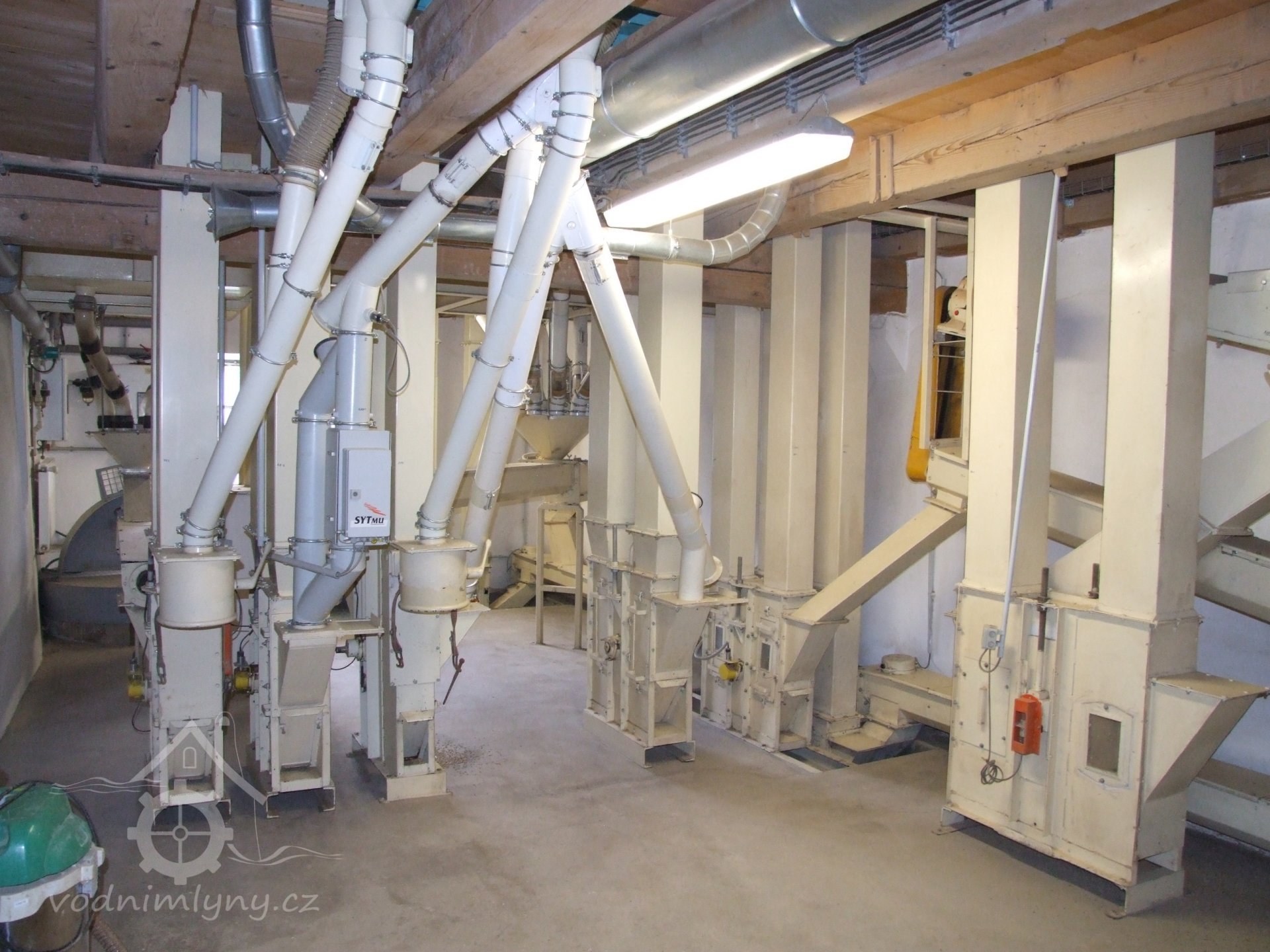 Mlýn Na Závodí č.p. 105, Holasovice – přízemí: celkový pohled; kapsové výtahy původní i moderní, červen 2023, © Jiří Hořák, (Prvky na obrázku: výtahy a dopravníky)