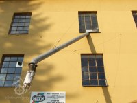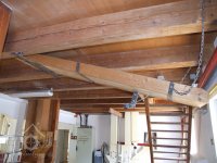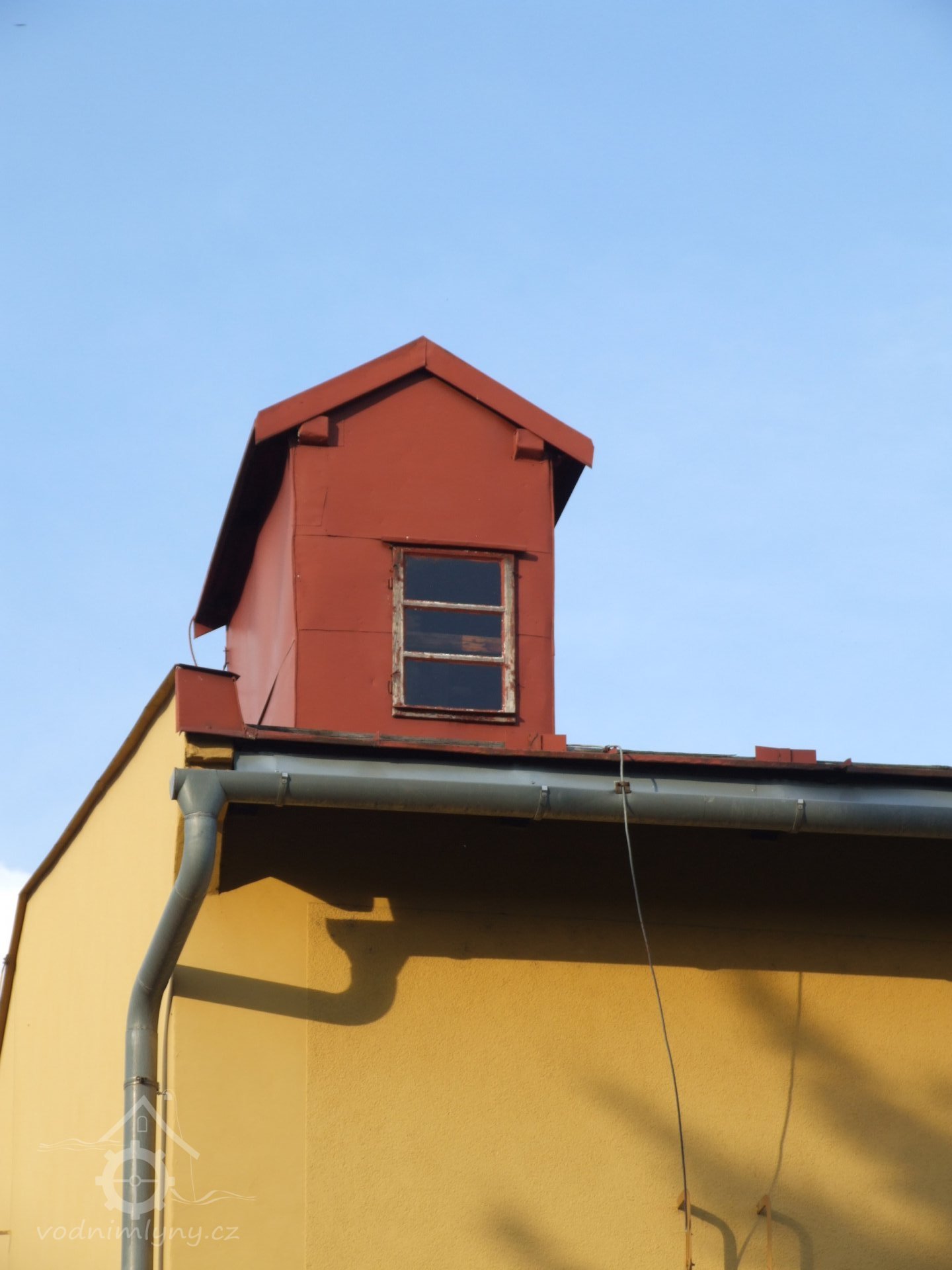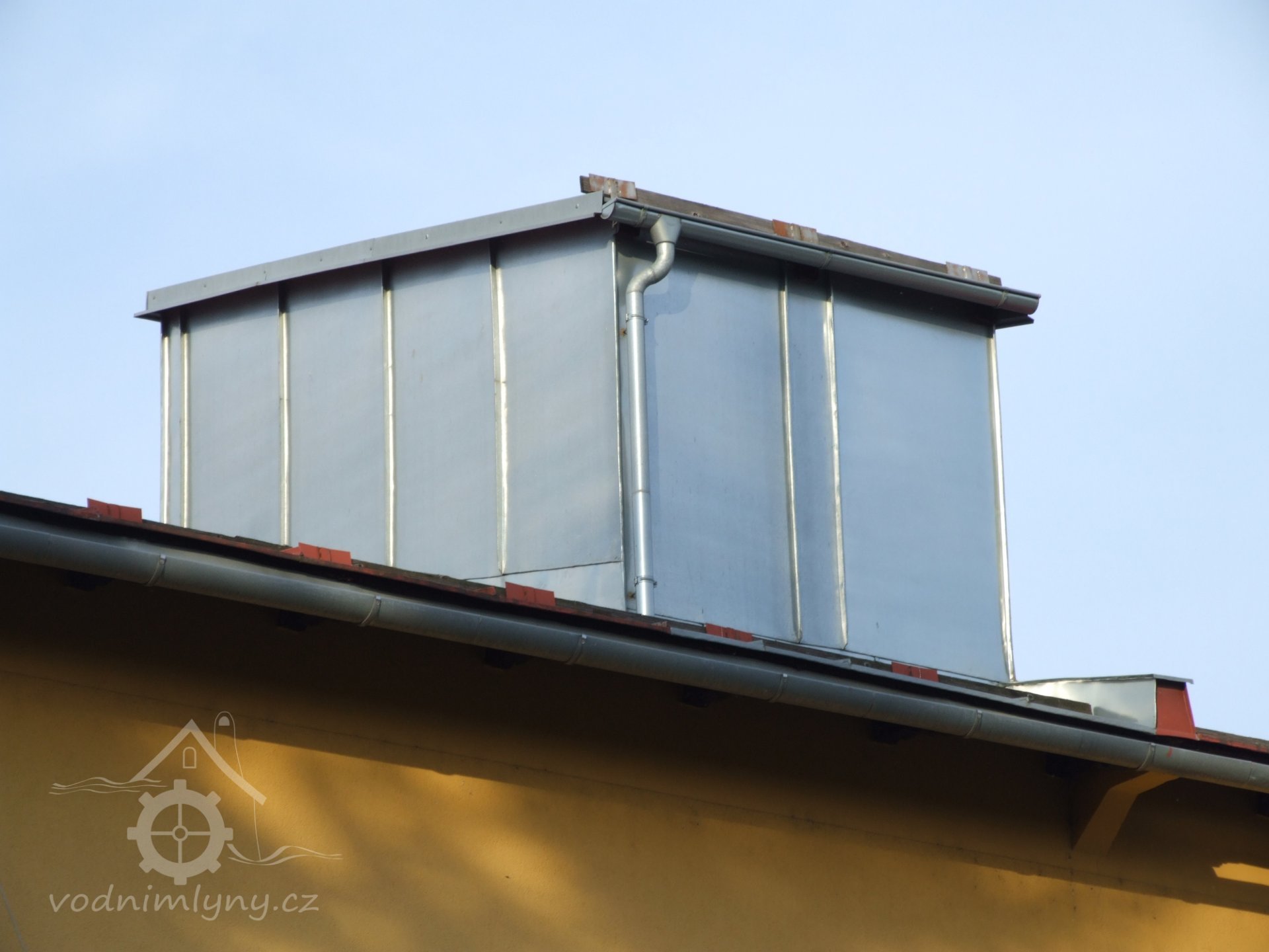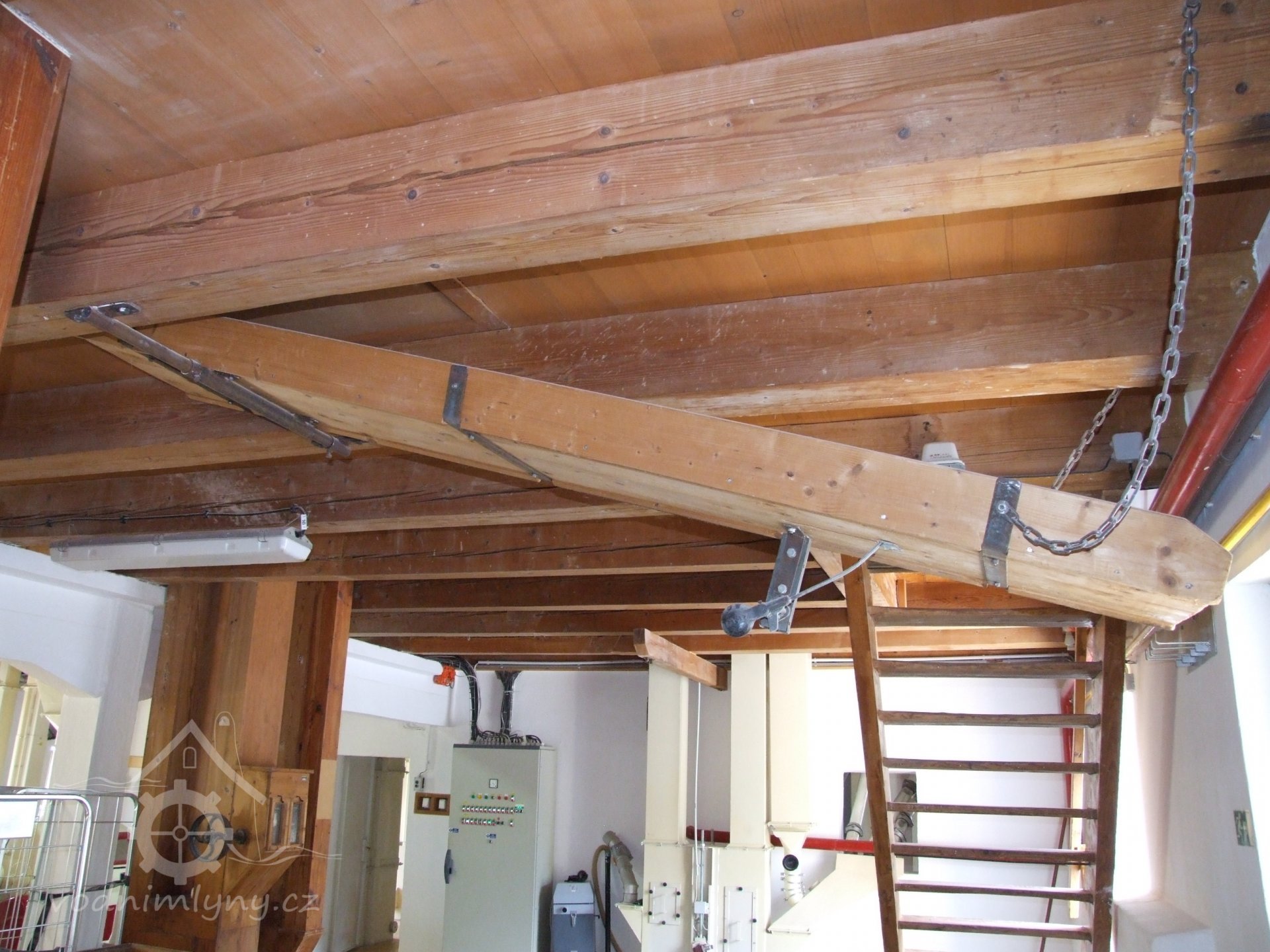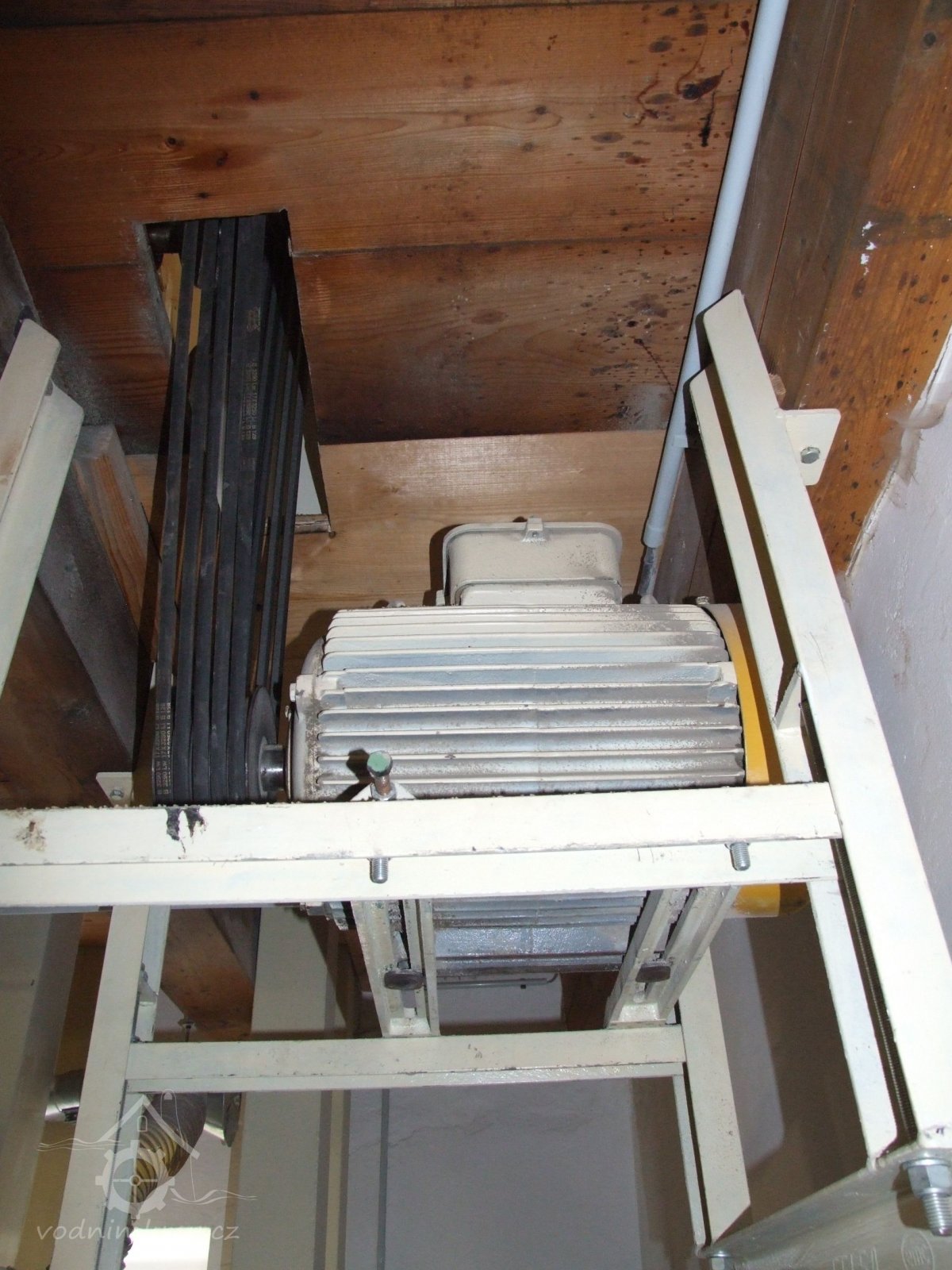 Mlýn Na Závodí č.p. 105, Holasovice – podstřeší: hlava moderního kapsového výtahu, červen 2023, © Jiří Hořák, (Prvky na obrázku: výtahy a dopravníky)