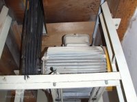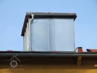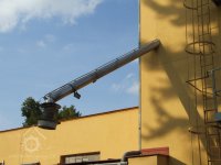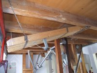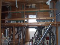Mlýn Na Závodí č.p. 105, Holasovice – podstřeší: hlavy moderních kapsových výtahů, červen 2023, © Jiří Hořák, (Prvky na obrázku: výtahy a dopravníky)