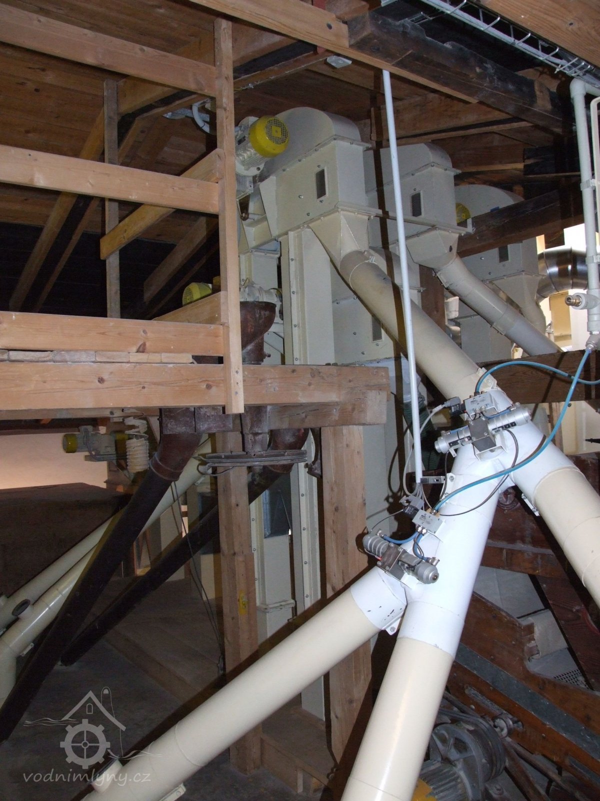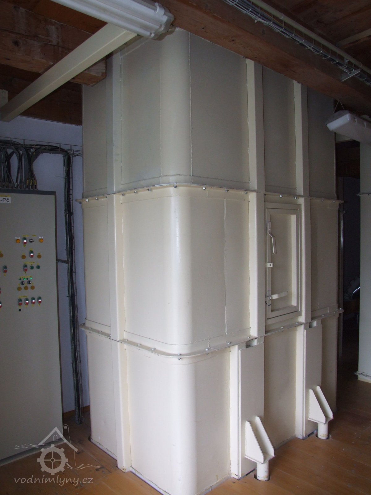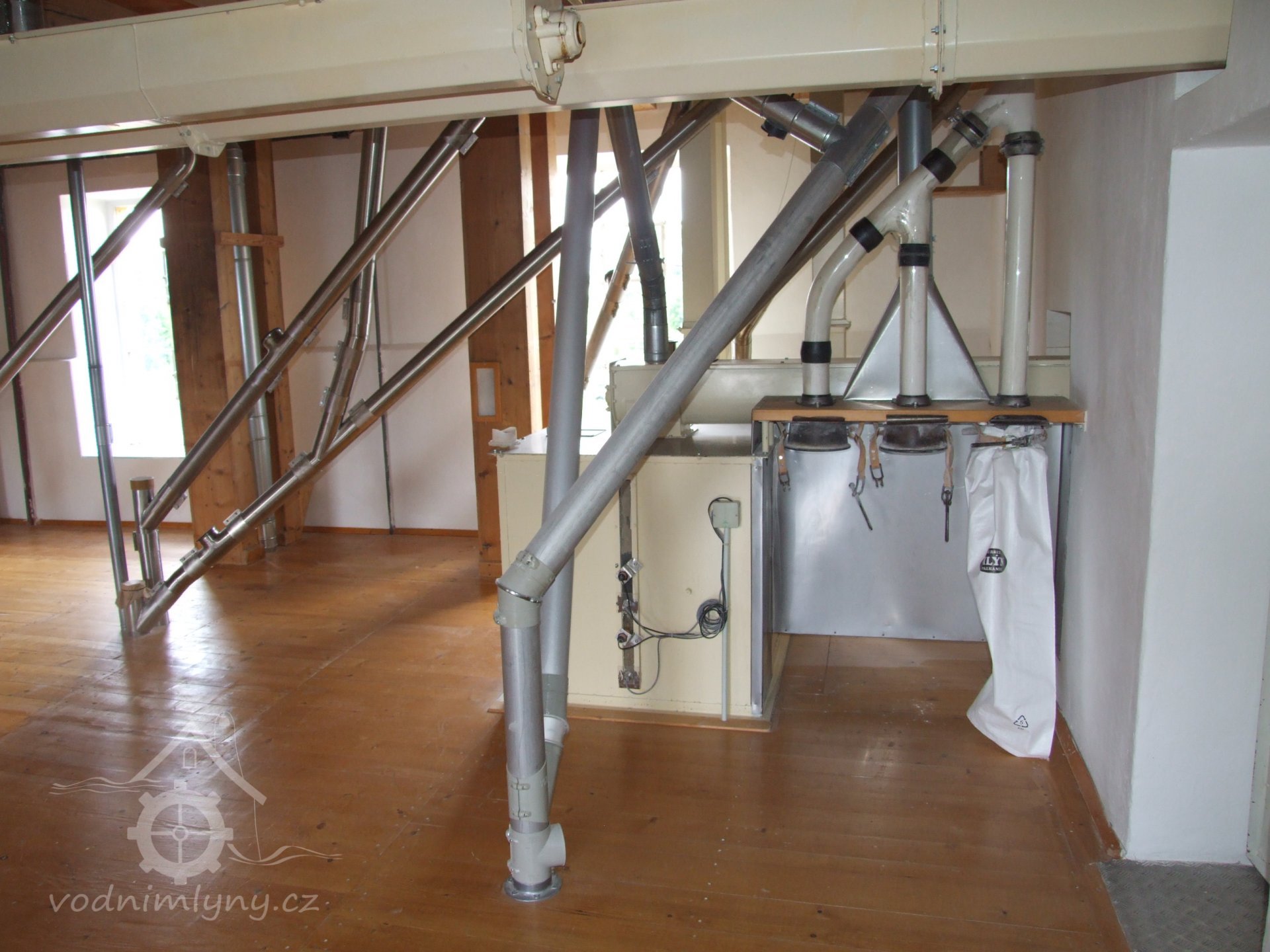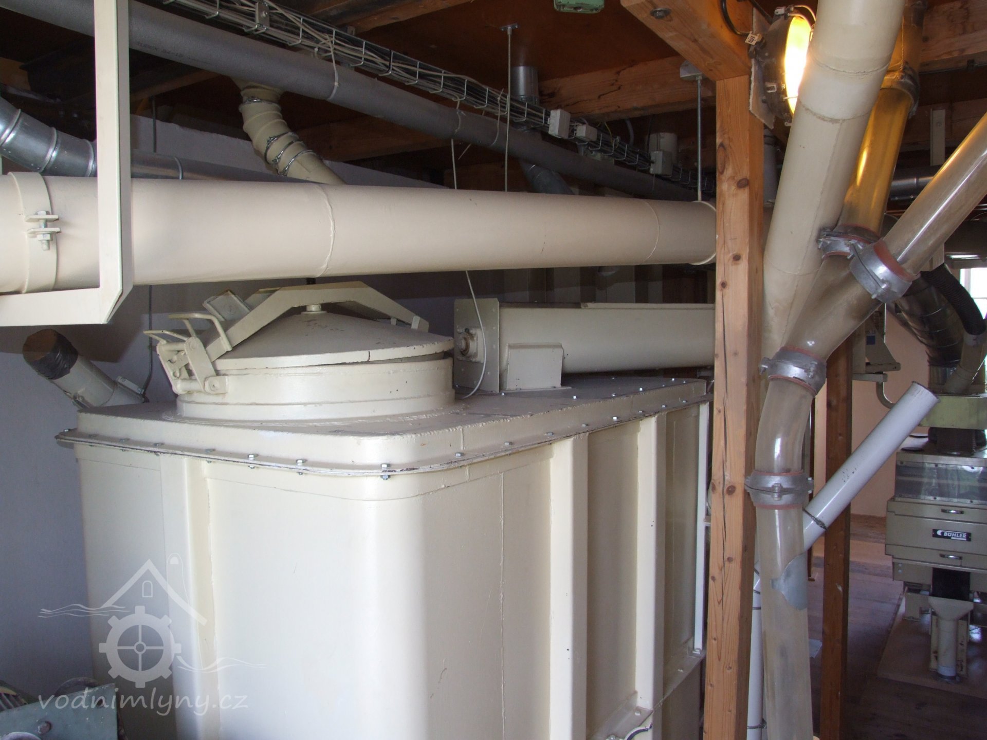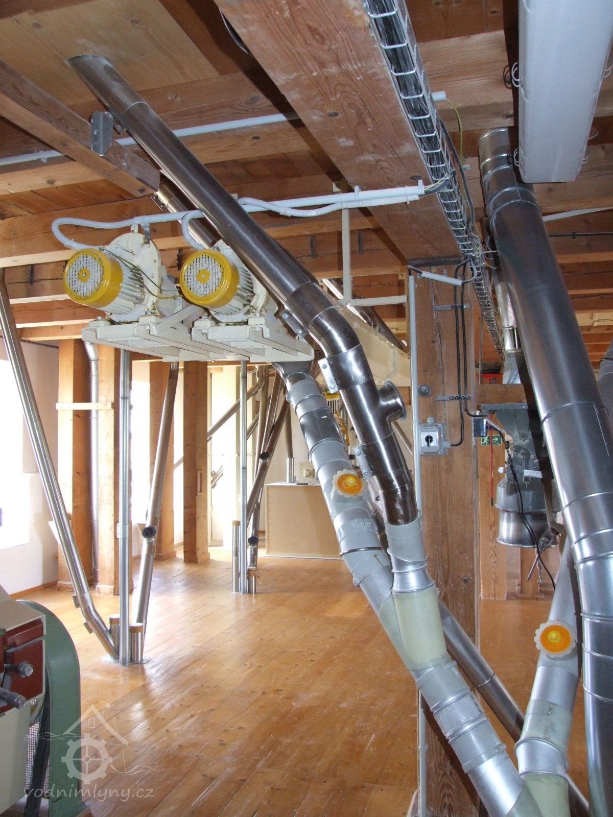 Mlýn Na Závodí č.p. 105, Holasovice – 1. patro: moderní dopravníky, červen 2023, © Jiří Hořák, (Prvky na obrázku: výtahy a dopravníky)