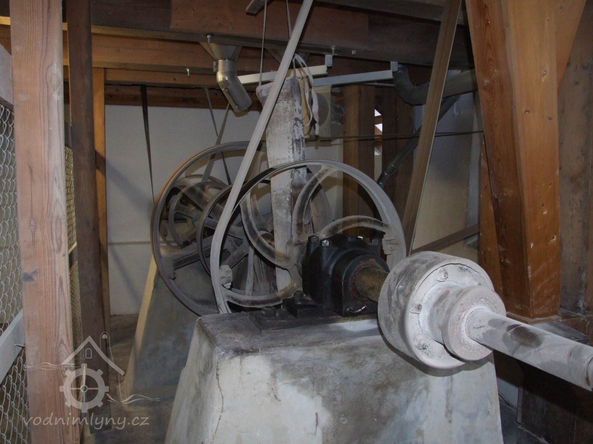 Mlýn Na Závodí č.p. 105, Holasovice – povodní strana turbínového domku: současný pohon spodní (hlavní) mlýnské transmise, červen 2023, © Jiří Hořák, (Prvky na obrázku: Turbína, transmise, řemenice, převody)