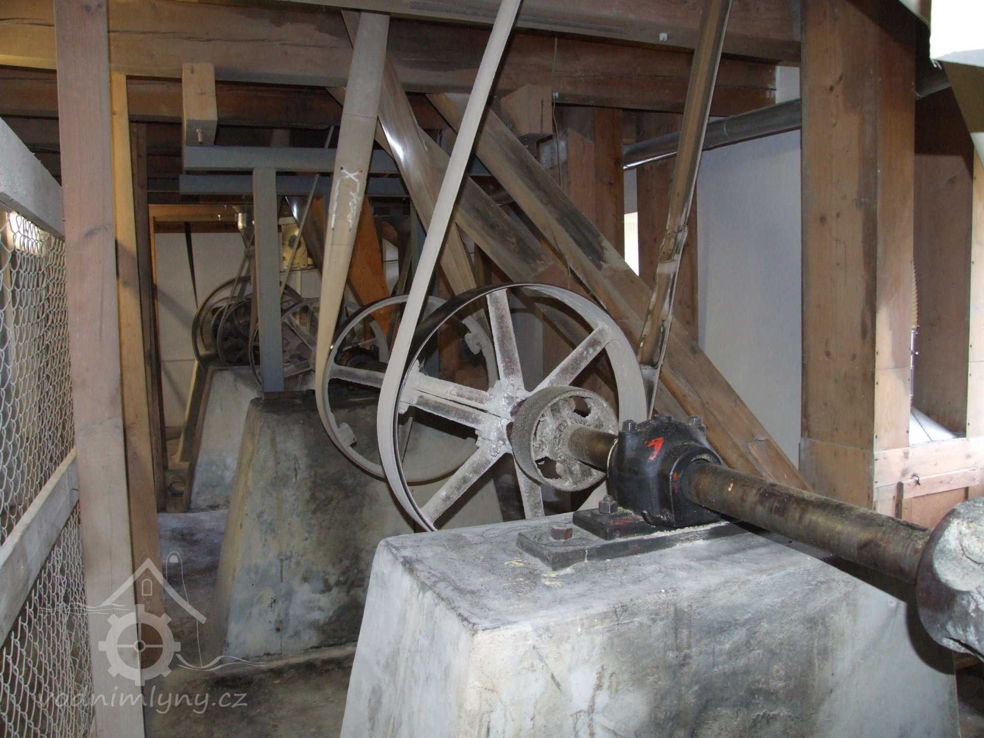 Mlýn Na Závodí č.p. 105, Holasovice – suterén: druhý současný pohon mlecího složení, červen 2023, © Jiří Hořák, (Prvky na obrázku: transmise, řemenice, převody - transmisní hřídele s řemenicemi (výrobek průmyslový i řemeslný))