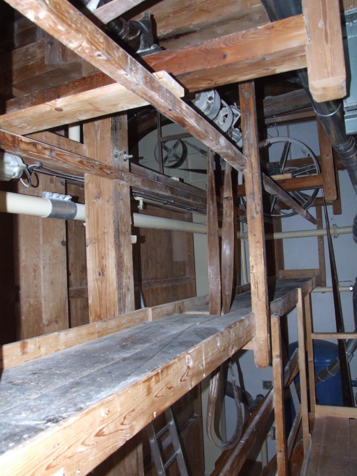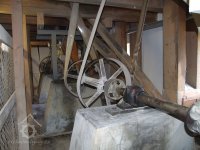 Mlýn Na Závodí č.p. 105, Holasovice – 2. patro: horní (rozvodová) mlýnská transmise, červen 2023, © Jiří Hořák, (Prvky na obrázku: transmise, řemenice, převody)