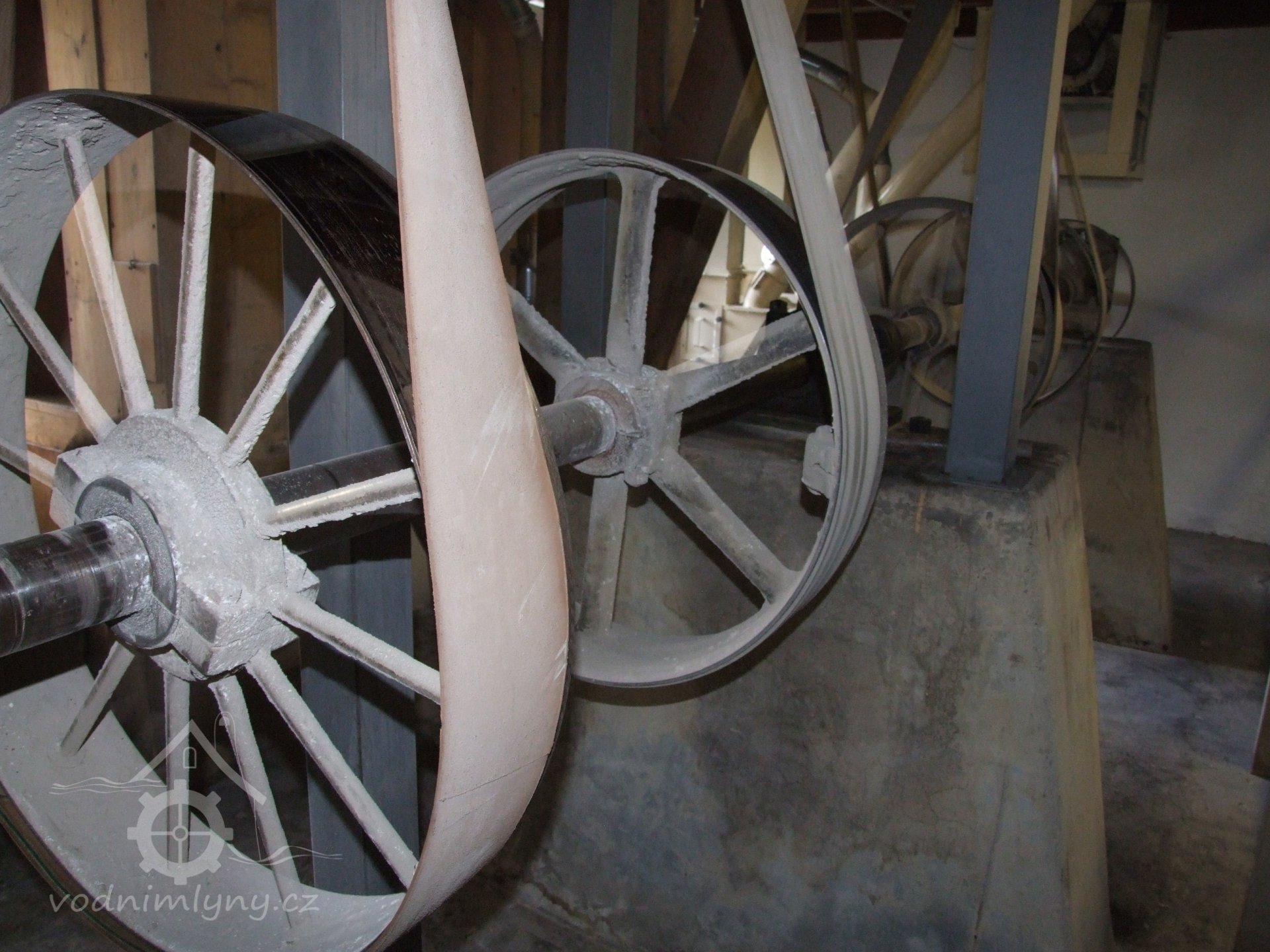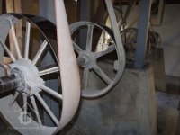 Mlýn Na Závodí č.p. 105, Holasovice – suterén: spodní (hlavní) mlýnská transmise, největší řemenice převádí pohon od elektromotoru, červen 2023, © Jiří Hořák, (Prvky na obrázku: transmise, řemenice, převody, transmise, řemenice, převody - transmisní hřídele s řemenicemi (výrobek průmyslový i řemeslný))