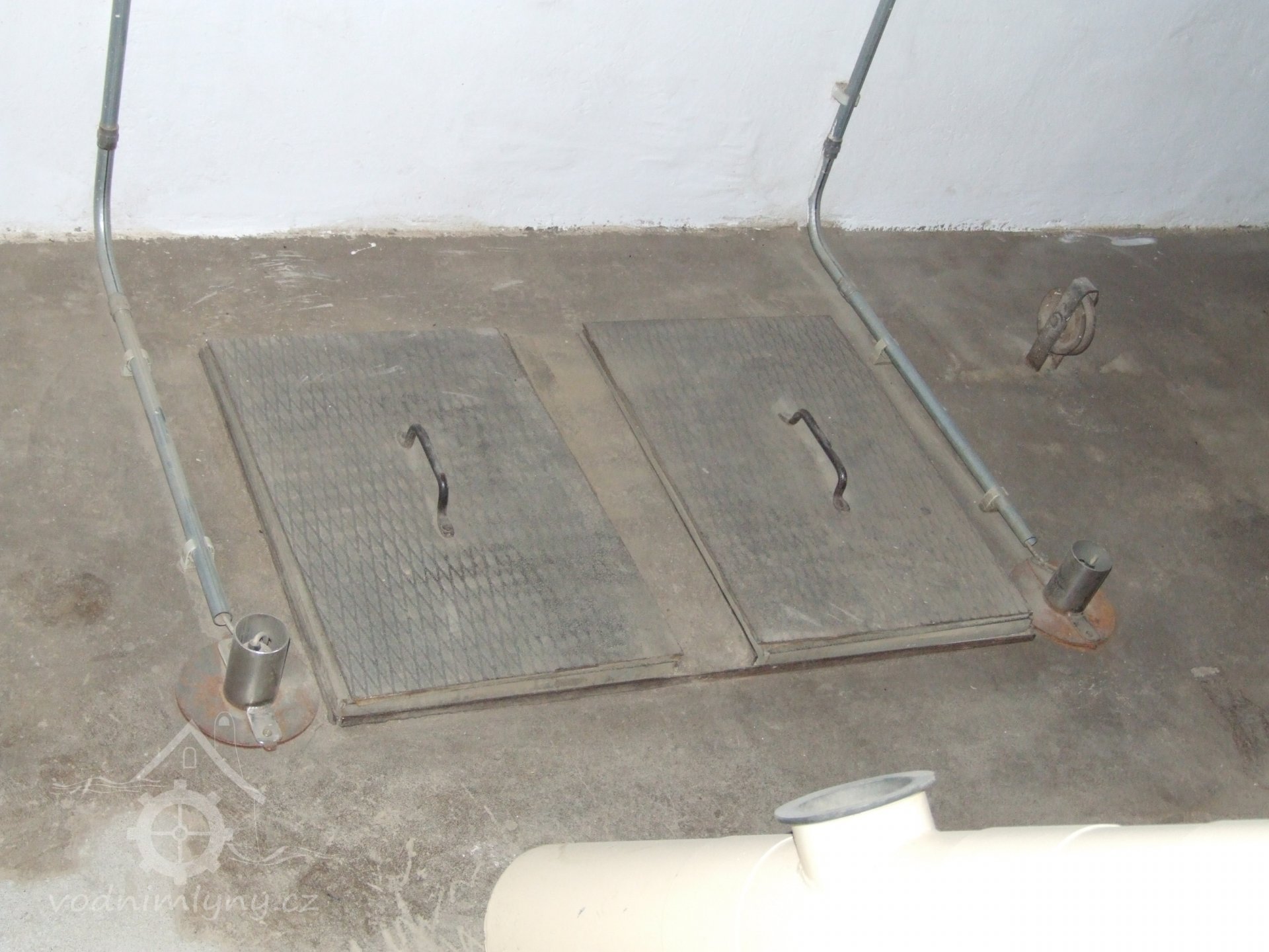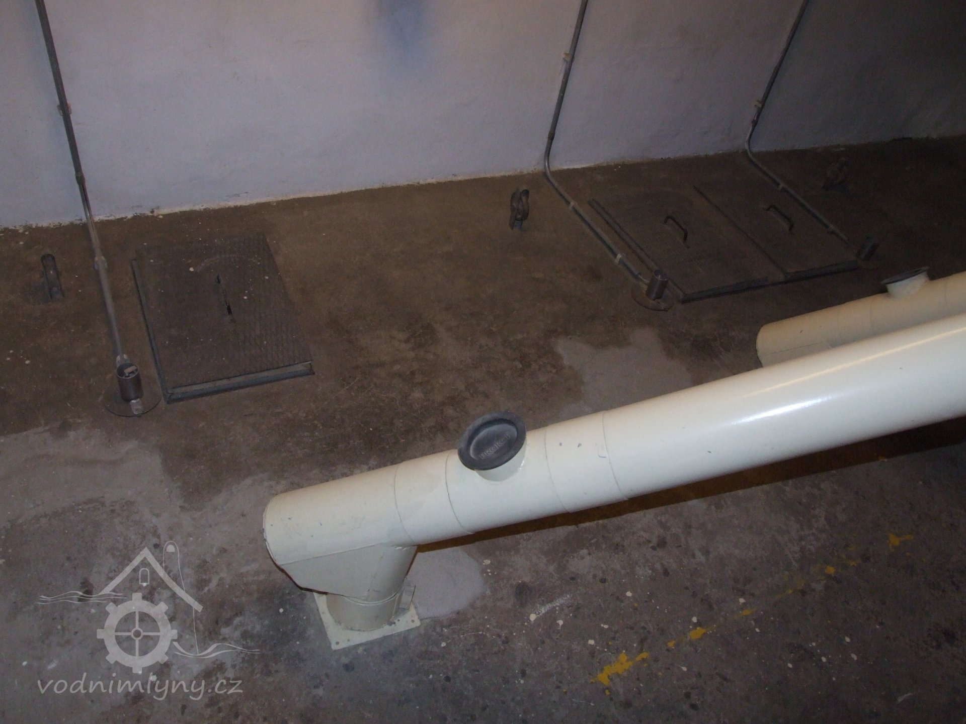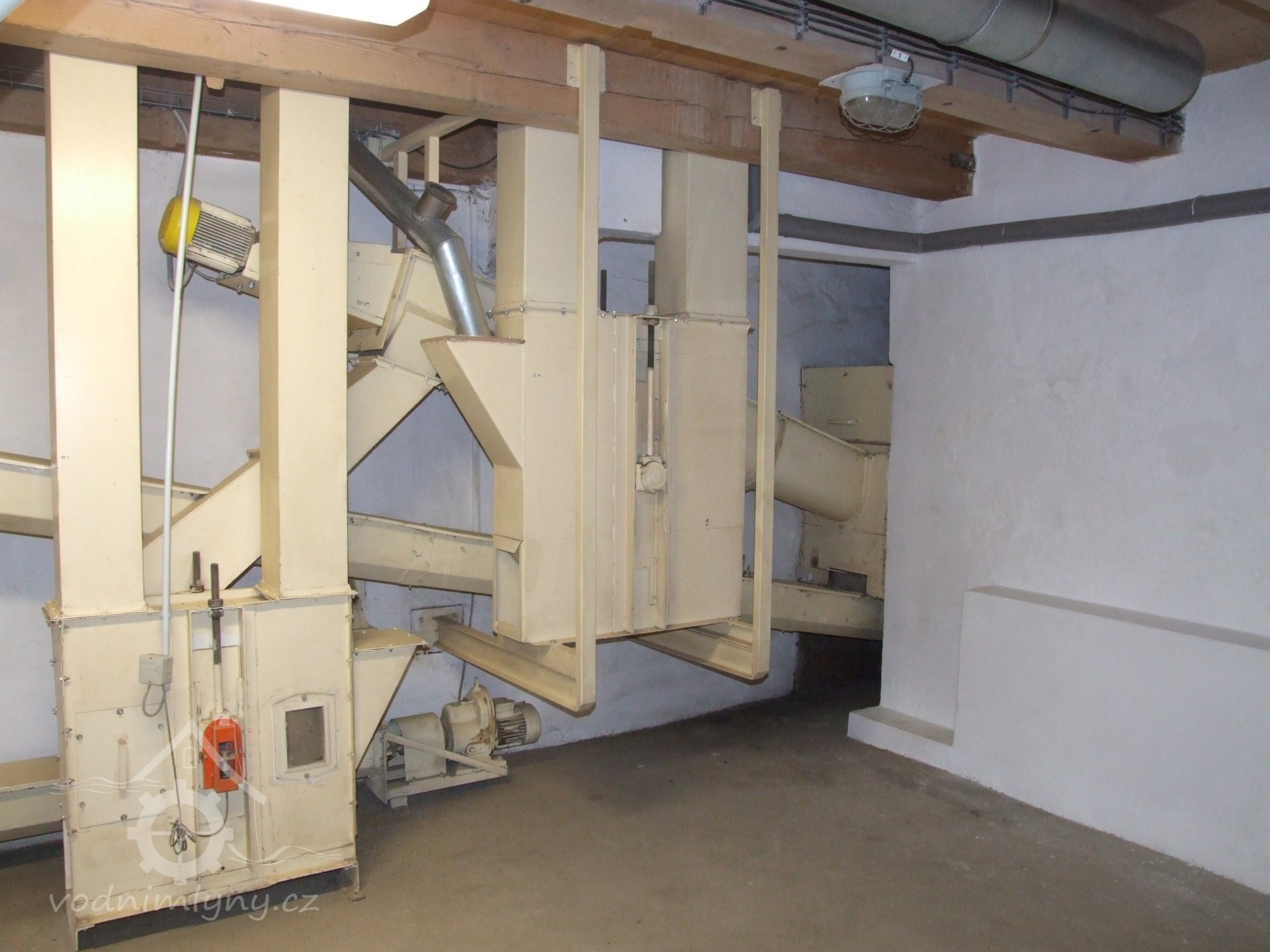 Mlýn Na Závodí č.p. 105, Holasovice – suterén: prostor pod čističkou obilí s moderními dopravníky téhož, červen 2023, © Jiří Hořák, (Prvky na obrázku: výtahy a dopravníky)