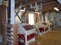 Mlýn Na Závodí č.p. 105, Holasovice – přízemí: srdce mlýna, moderní dvoupárové válcové mlecí stolice ("tuplovky"), červen 2023, © Jiří Hořák, (Prvky na obrázku: válcová stolice)