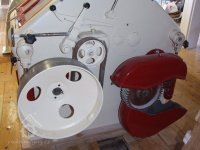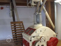 Mlýn Na Závodí č.p. 105, Holasovice – přízemí: srdce mlýna, moderní dvoupárová válcová mlecí stolice ("tuplovka"), červen 2023, © Jiří Hořák, (Prvky na obrázku: válcová stolice)