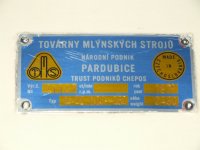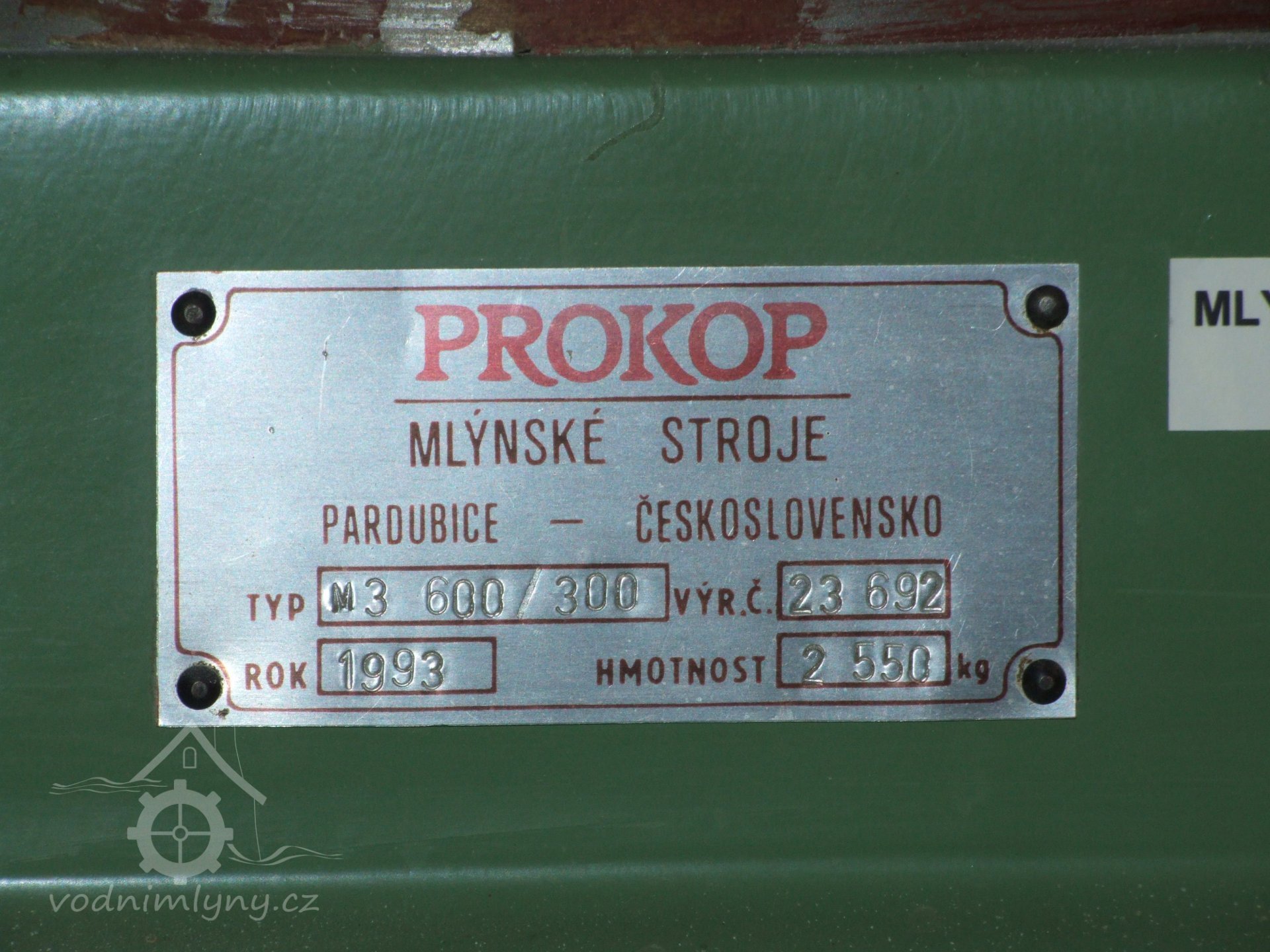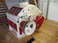 Mlýn Na Závodí č.p. 105, Holasovice – 1. patro: výrobní štítek srdce mlýna, moderní dvoupárové válcové mlecí stolice ("tuplovky"), červen 2023, © Jiří Hořák, (Prvky na obrázku: válcová stolice, značka výrobce na technologickém vybavení)