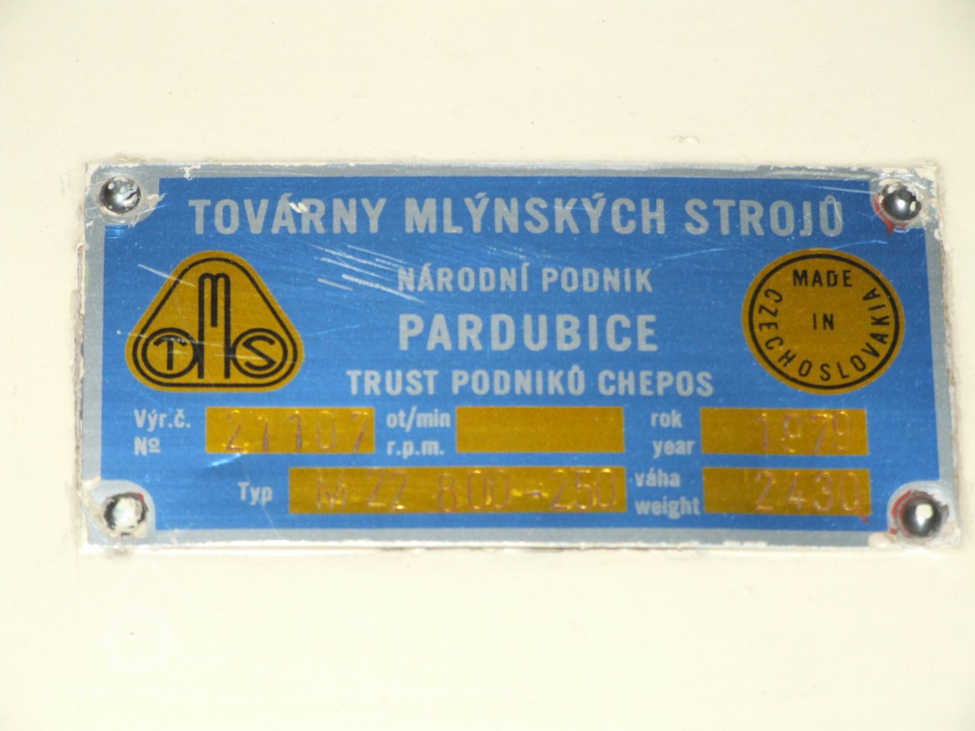 Mlýn Na Závodí č.p. 105, Holasovice – suterén: výrobní štítek moderní dopravy obilí, červen 2023, © Jiří Hořák, (Prvky na obrázku: značka výrobce na technologickém vybavení)