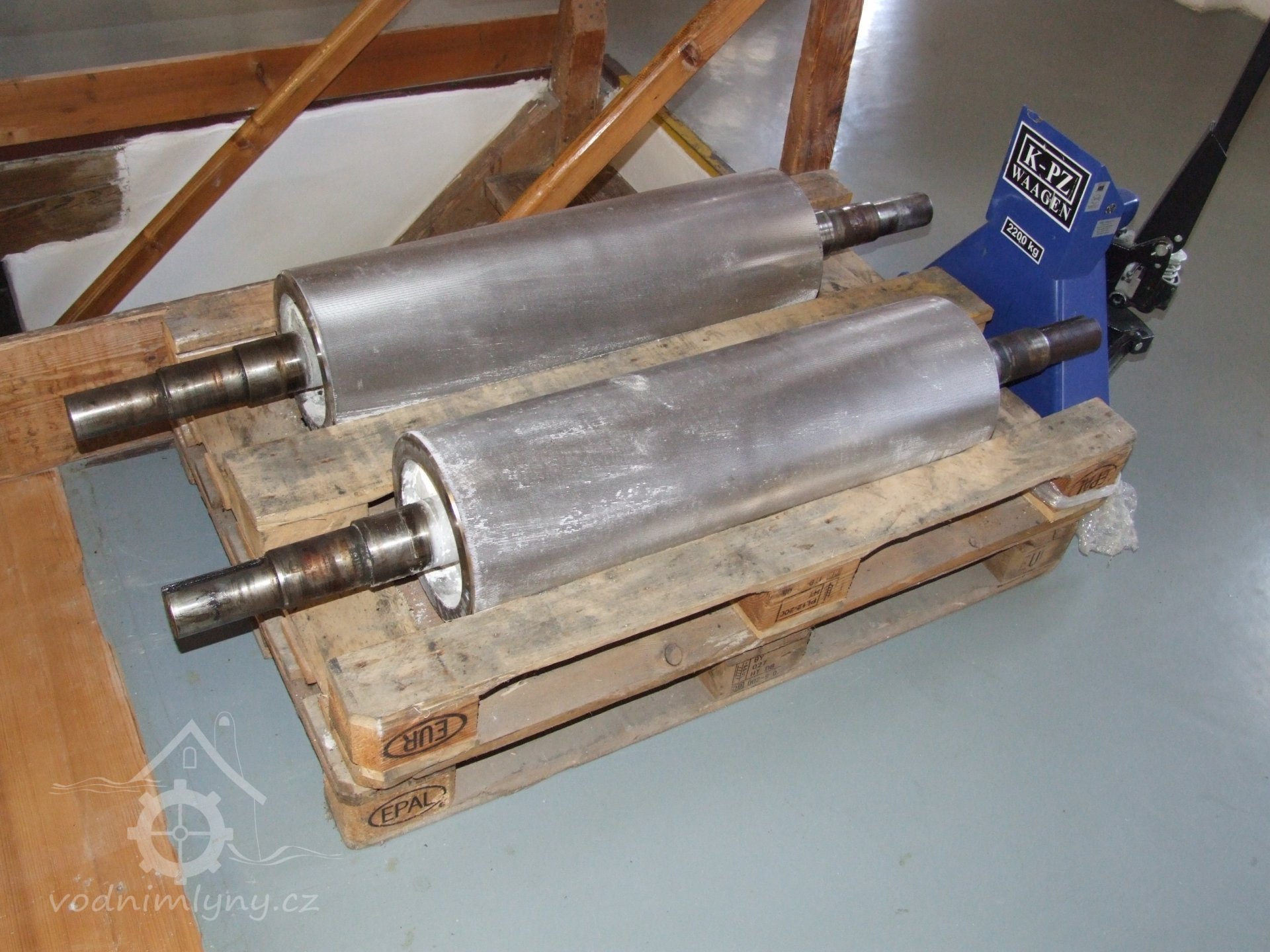 Mlýn Na Závodí č.p. 105, Holasovice – přízemí: náhradní ocelové rýhované válce pro srdce mlýna, moderní dvoupárové válcové mlecí stolice ("tuplovky"), červen 2023, © Jiří Hořák, (Prvky na obrázku: válcová stolice)