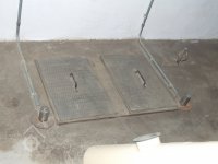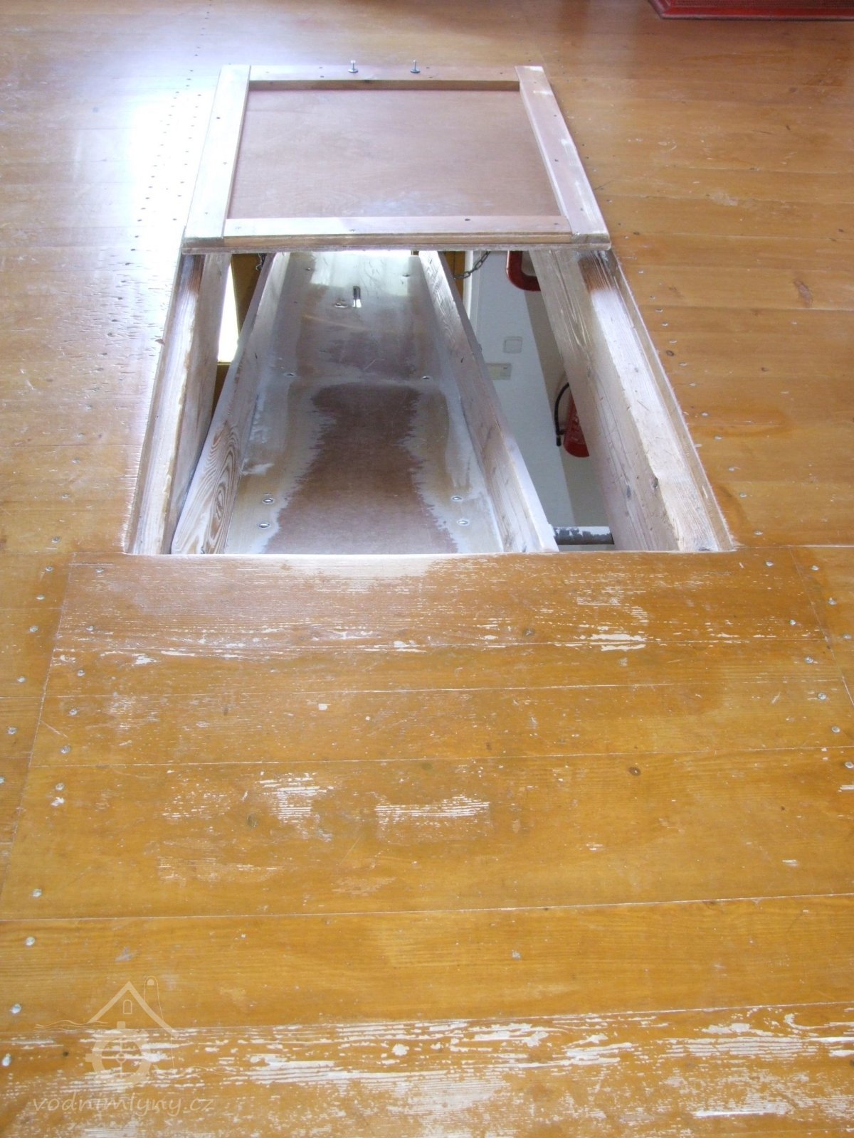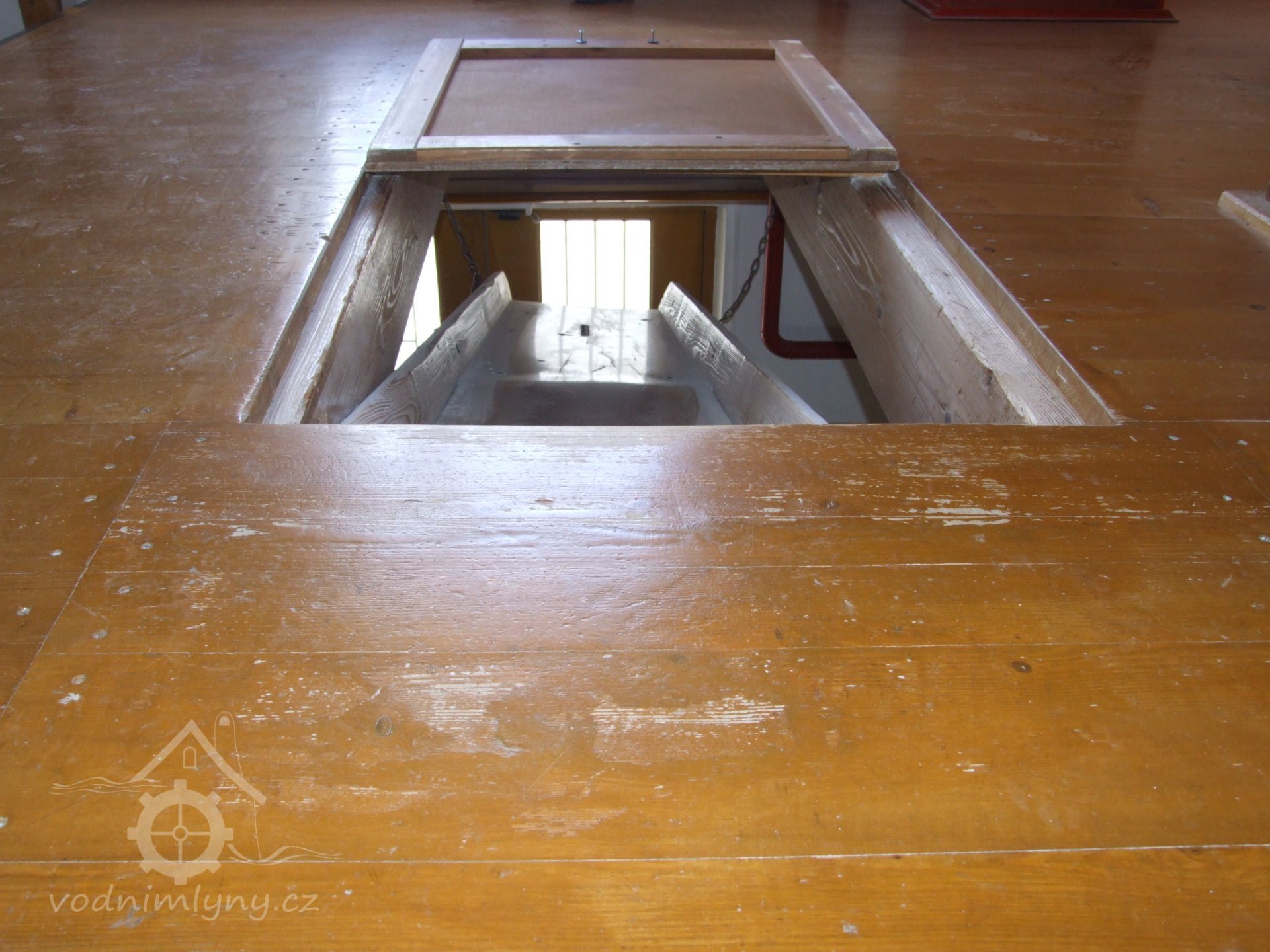 Mlýn Na Závodí č.p. 105, Holasovice – přízemí: rozkošný, ale rozkošný skluz na pytle, červen 2023, © Jiří Hořák, (Prvky na obrázku: výtahy a dopravníky)