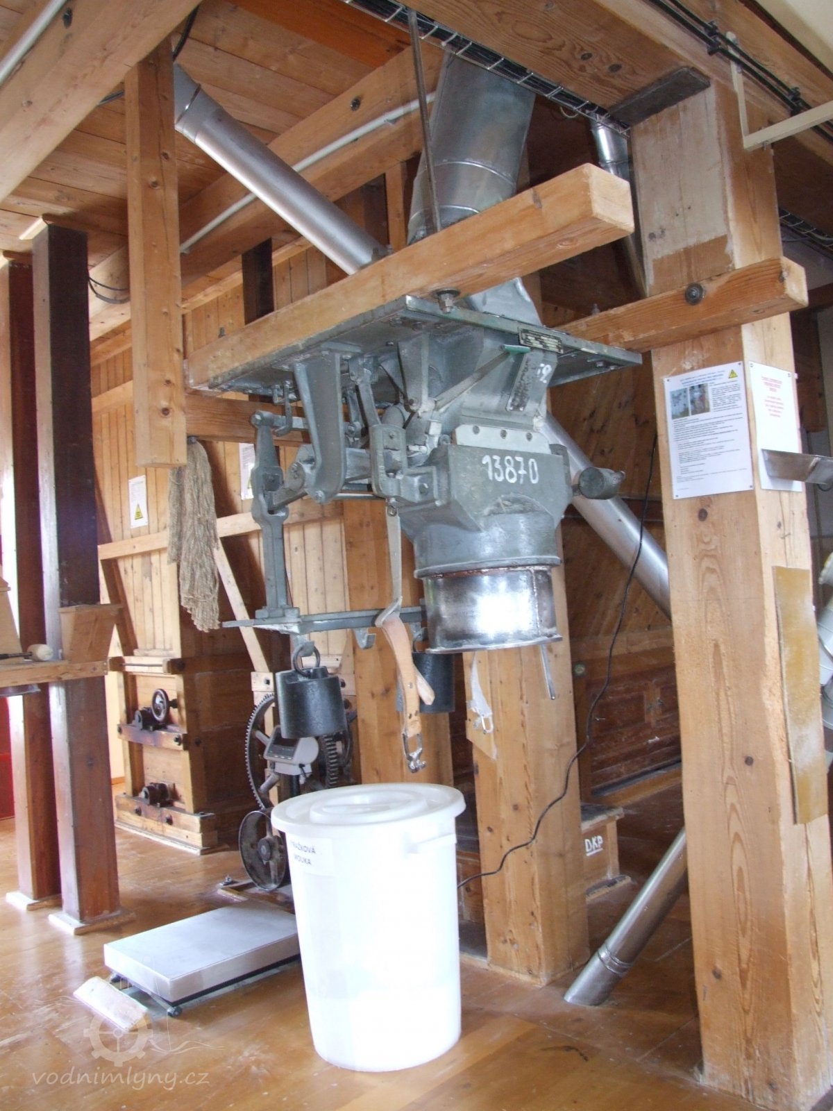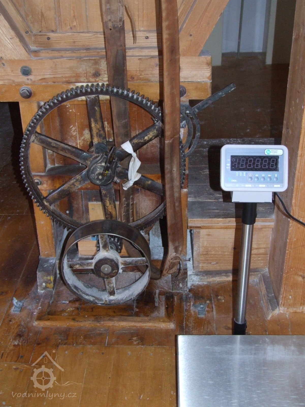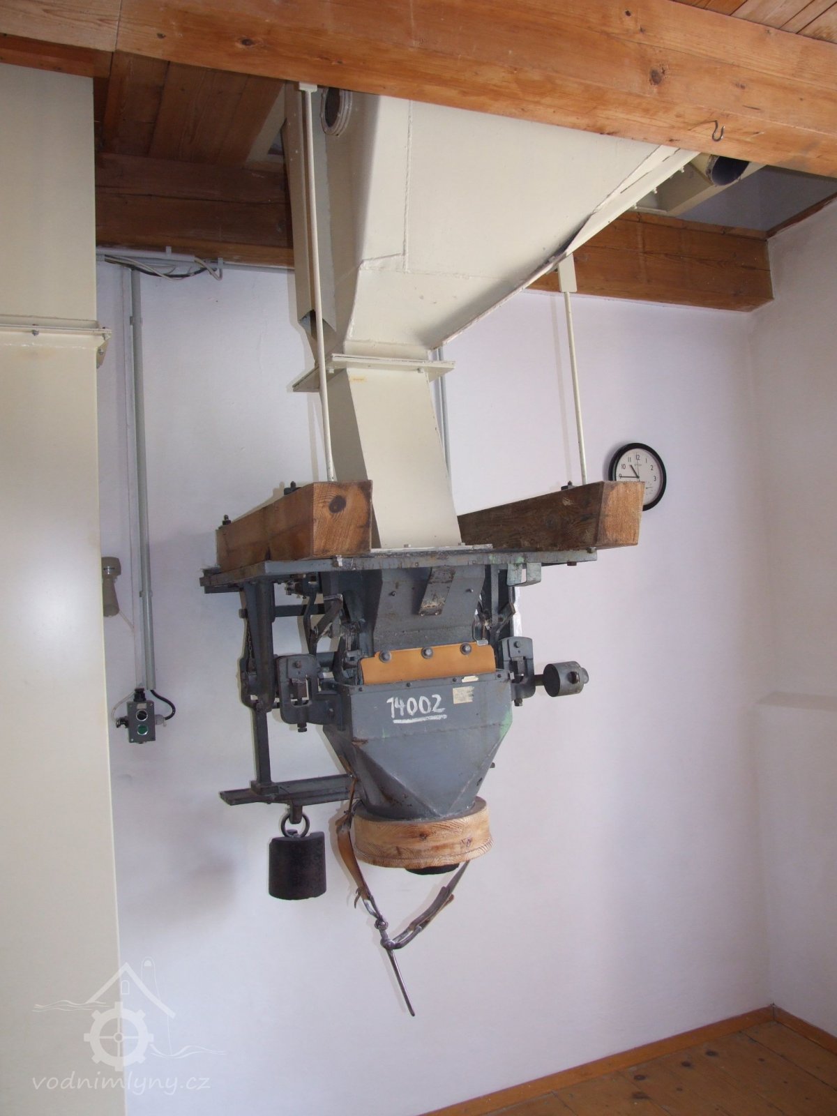 Mlýn Na Závodí č.p. 105, Holasovice – 1. patro: samočinná váha na obilí, červen 2023, © Jiří Hořák, (Prvky na obrázku: váha)