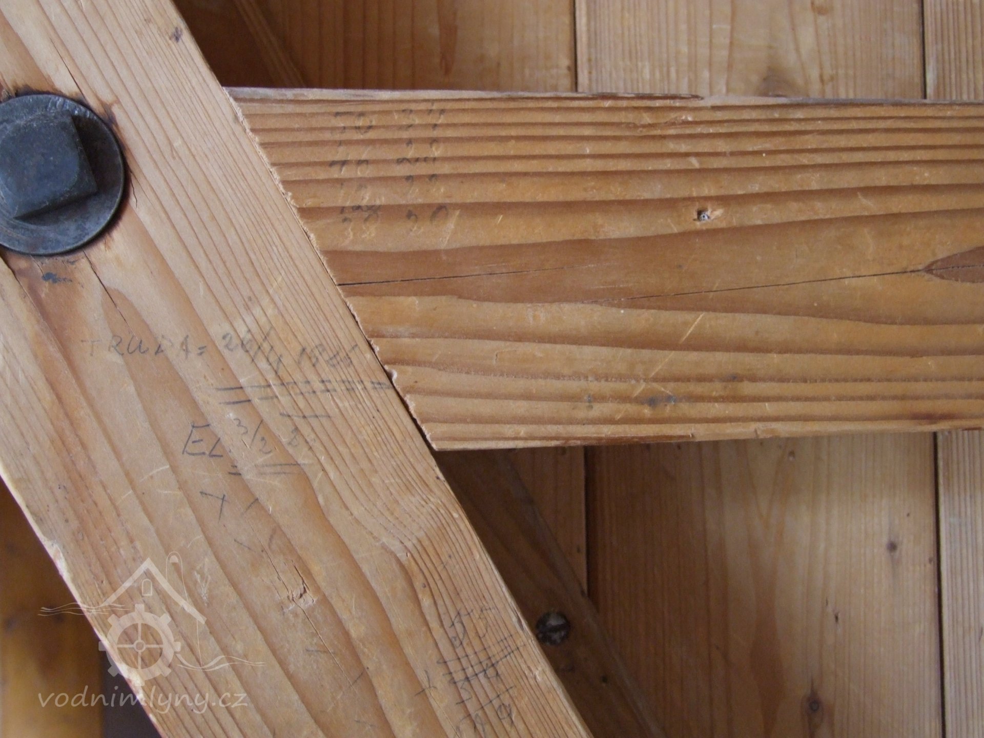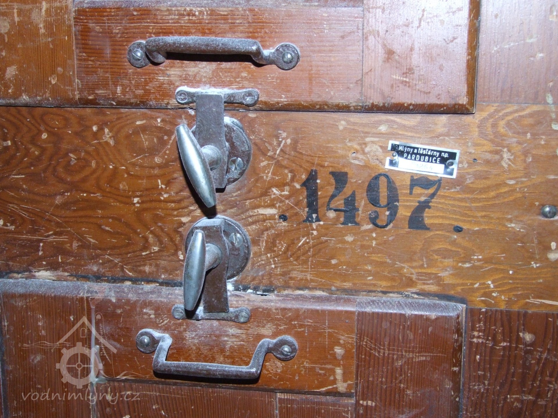 Mlýn Na Závodí č.p. 105, Holasovice – 1. patro: historické nápisy na čelní straně dvoukomorové dvouválcové (dva samostatné válce na jedné společné hřídeli) dvoupatrové moučné míchačky, červen 2023, © Jiří Hořák