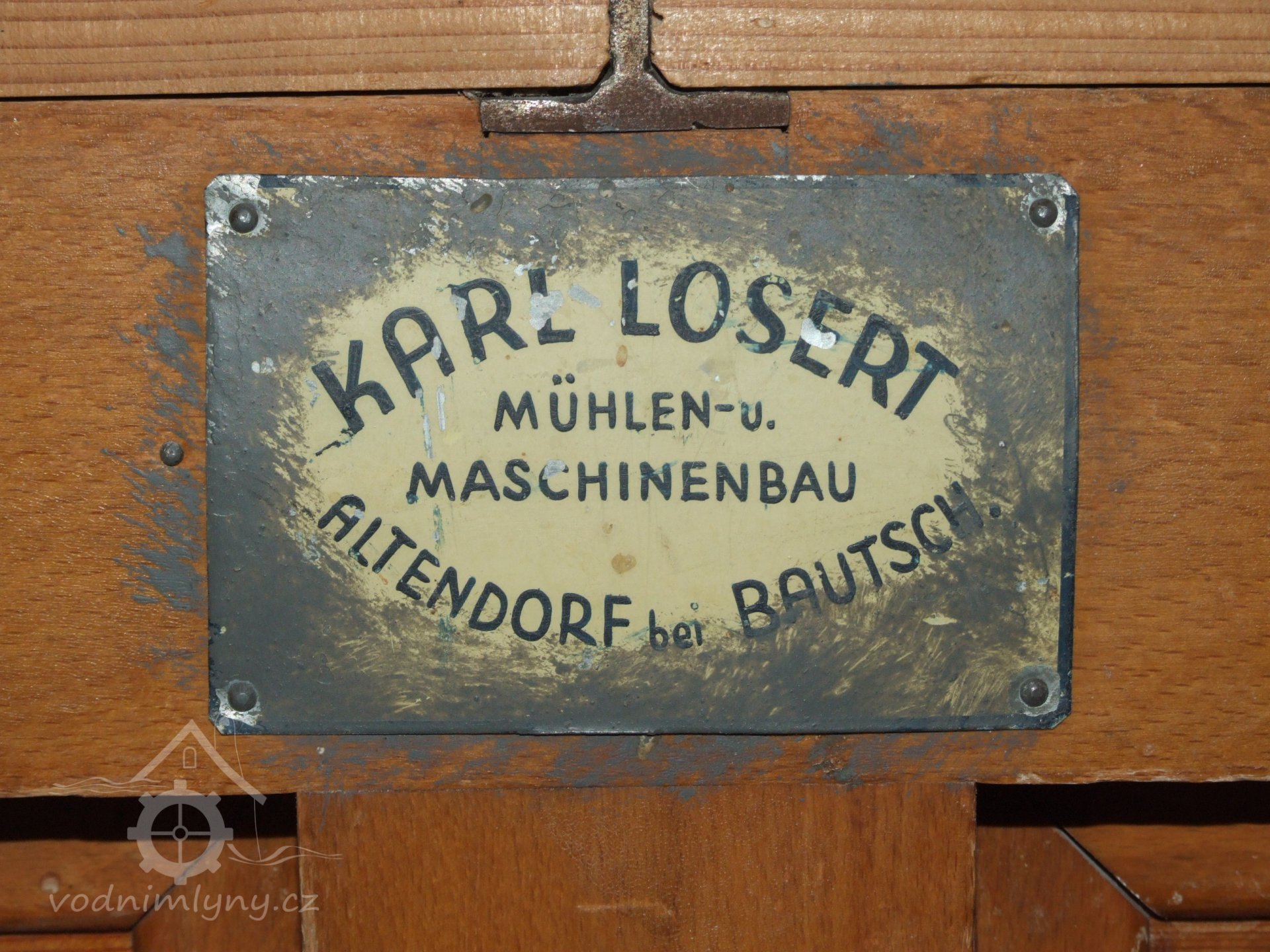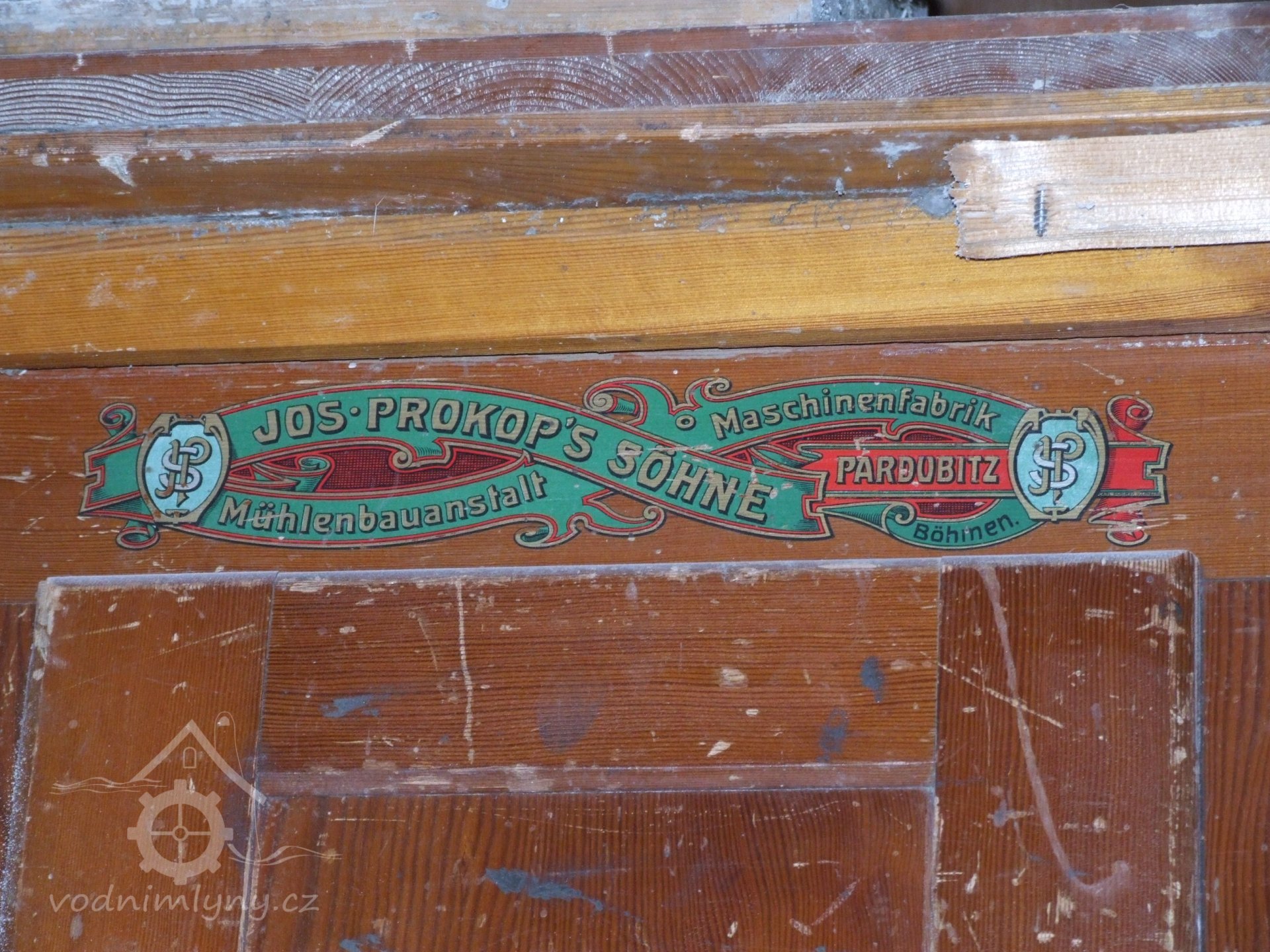 Mlýn Na Závodí č.p. 105, Holasovice – 1. patro: emblém na boční straně dvoukomorové dvouválcové (dva samostatné válce na jedné společné hřídeli) dvoupatrové moučné míchačky, červen 2023, © Jiří Hořák, (Prvky na obrázku: míchačka, značka výrobce na technologickém vybavení)